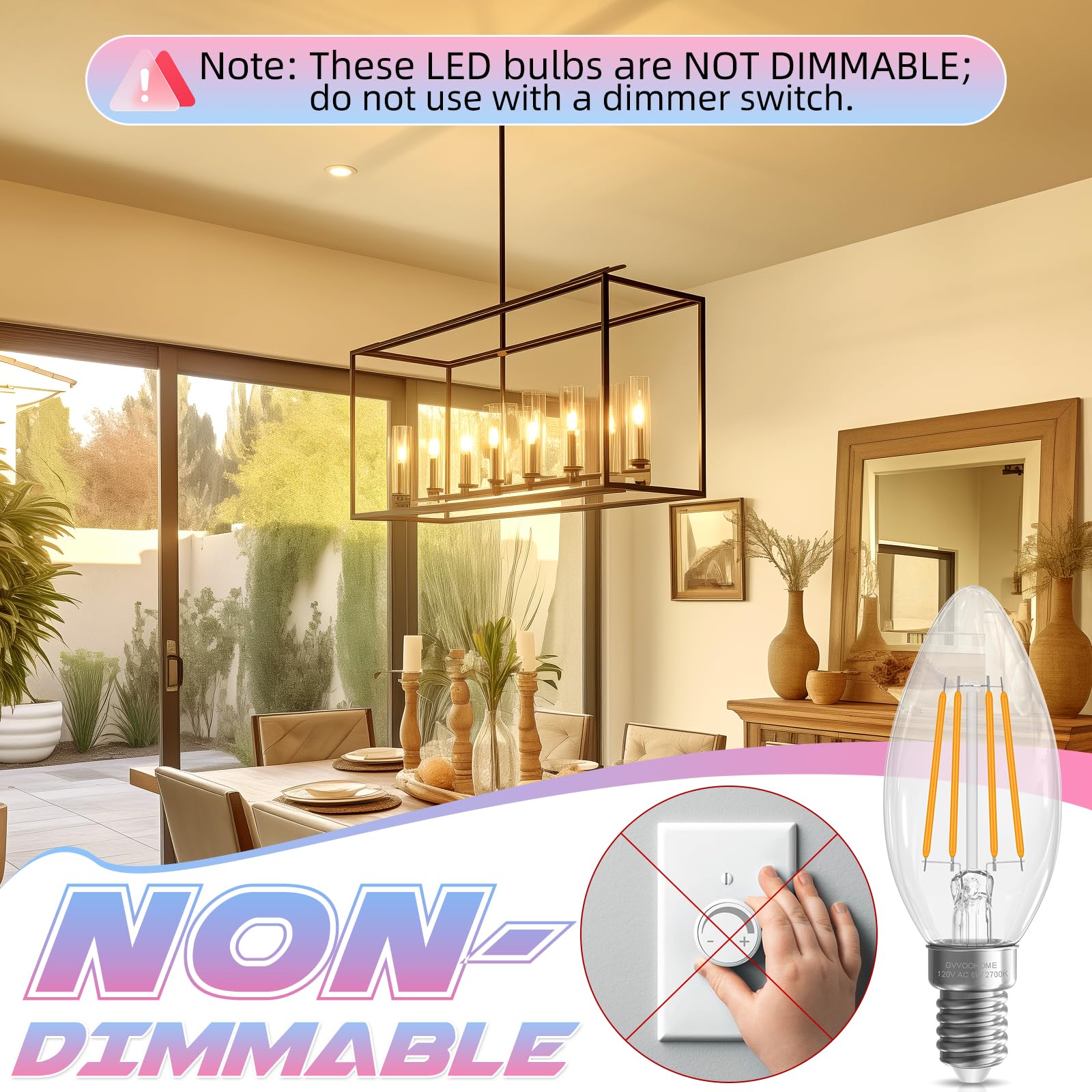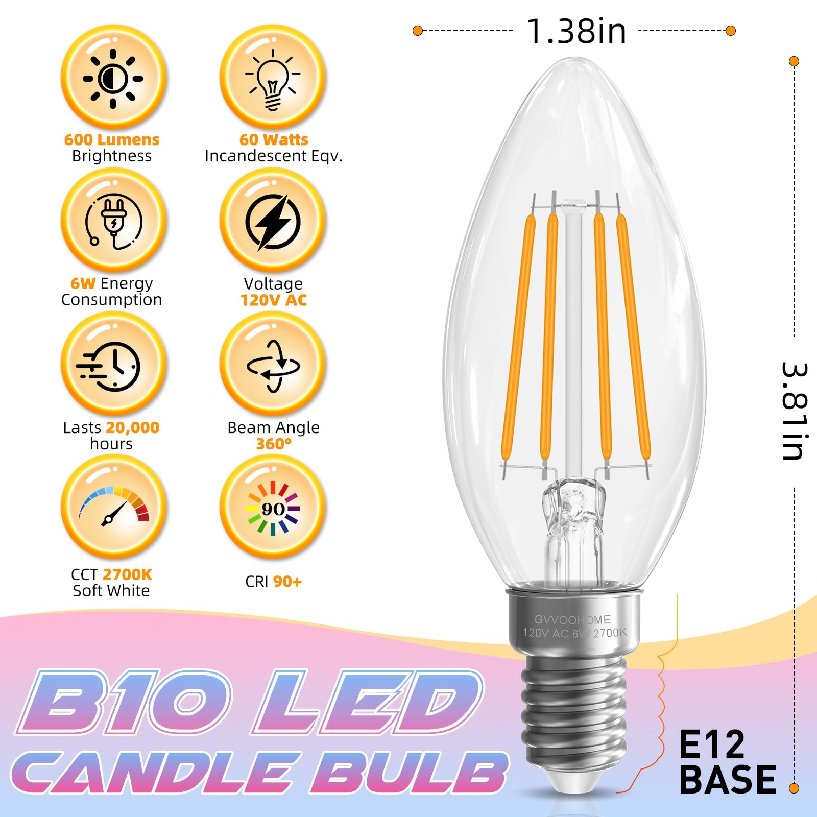 GvvooHome E12 Candelabra Bulb 2700K Soft White, 6W Equivalent to 60 watt, E12 LED Bulb Non-Dimmable, Chandelier Light Bulbs, B10 Candle Light Bulbs, 90+CRI, 600LM, Cear Glass, 12 Pack