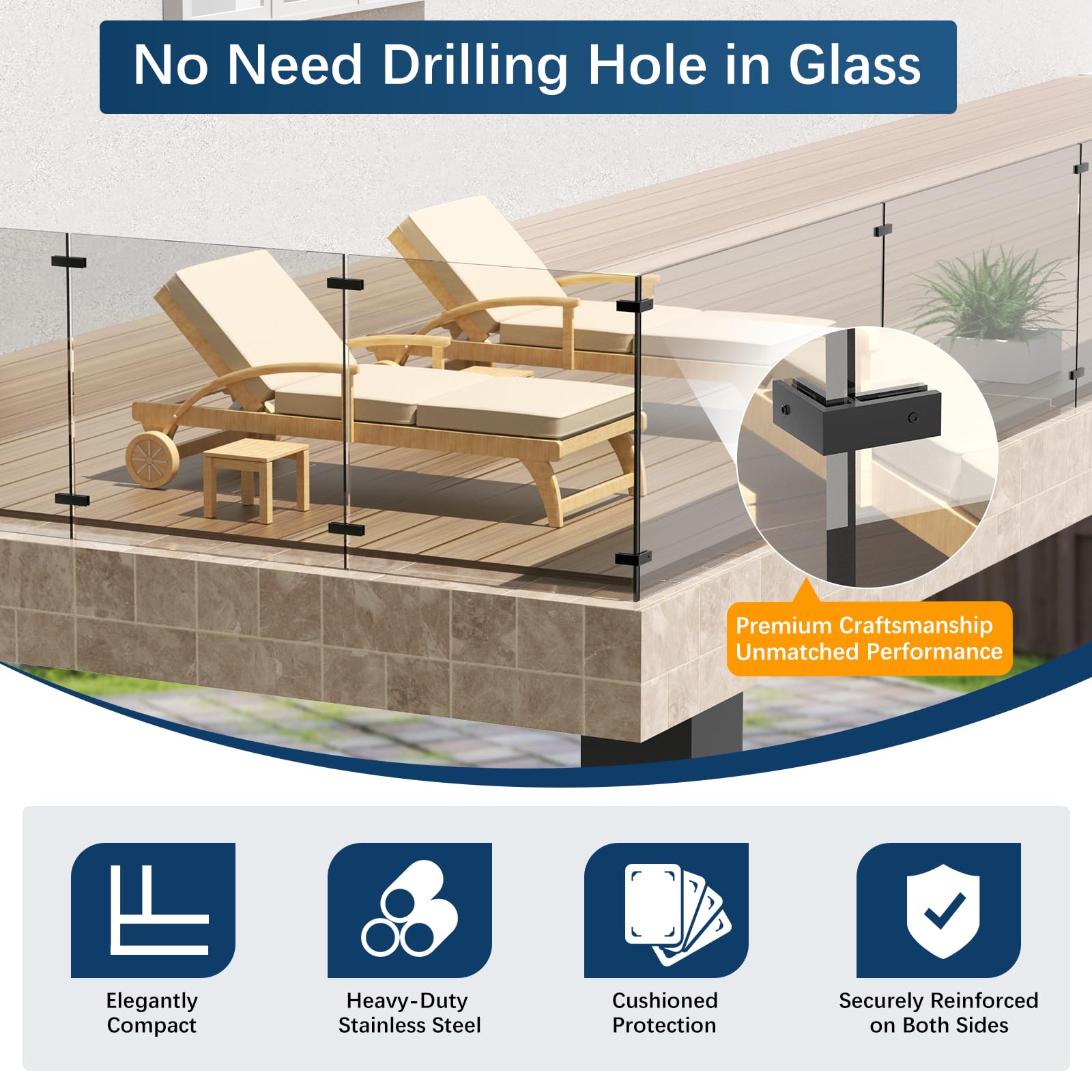 - Modern Design: Featuring a matte black style, this glass clamp adds a sleek and modern aesthetic to any railing system. Its minimalist design allows the beauty of the glass panels to shine through, creating a seamless and visually appealing look.