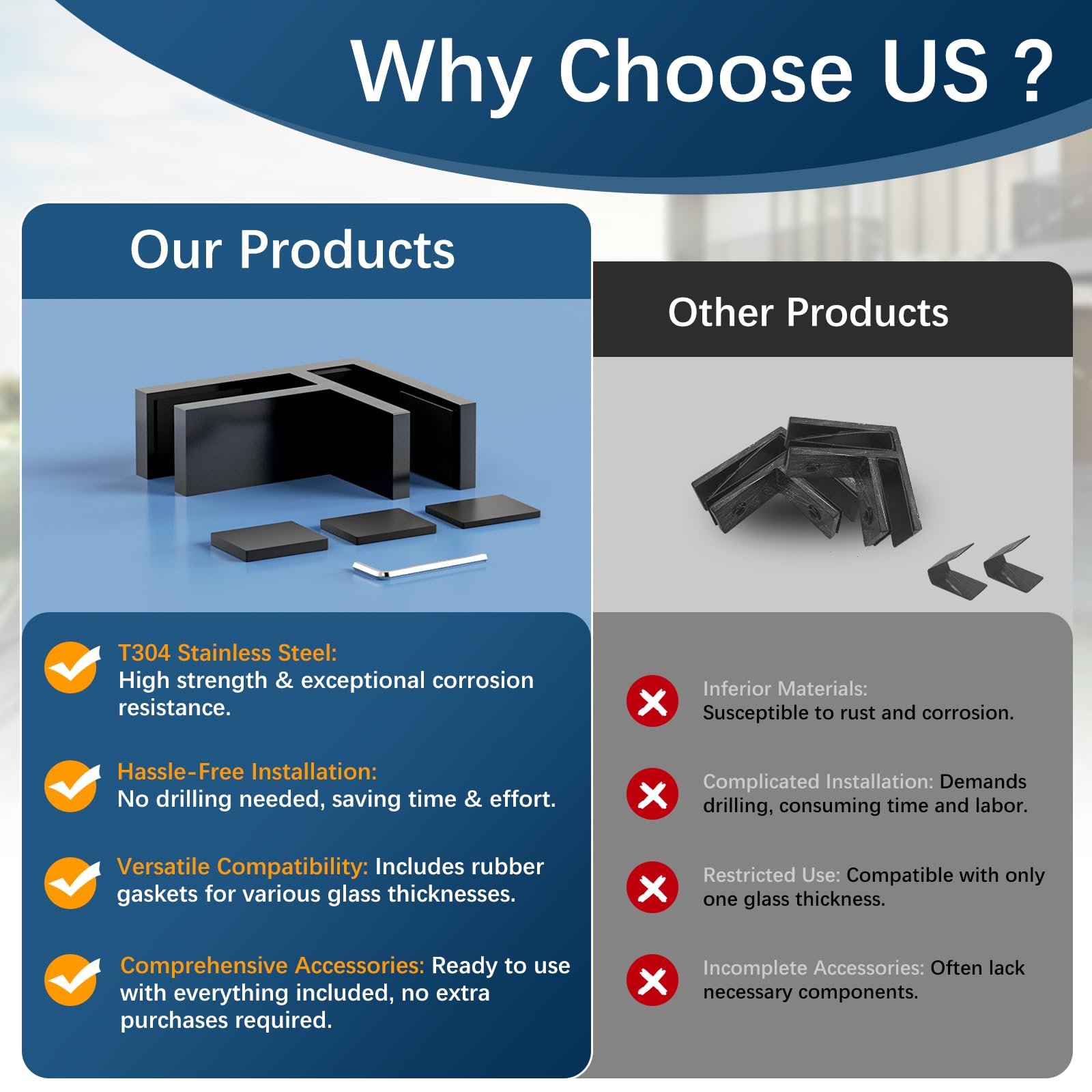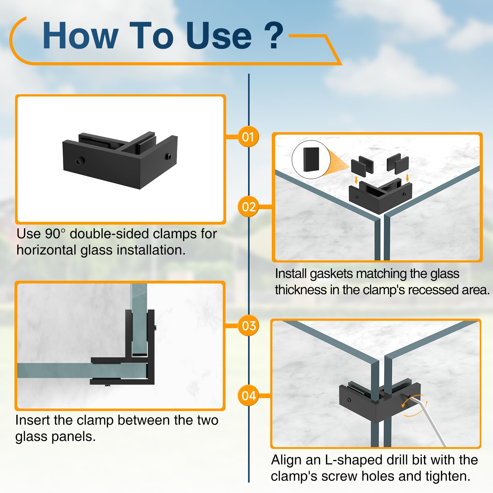 - Easy Installation: First choose a rubber gasket that fits the groove of the glass clamp. Then use an L-shaped drill bit to tighten the screw on both sides with the clamp. The glass brackets come with three types of adjustable EPDM rubber pads in sizes of 10mm, 12mm, and 13.52mm. Adjust them according to your needs.