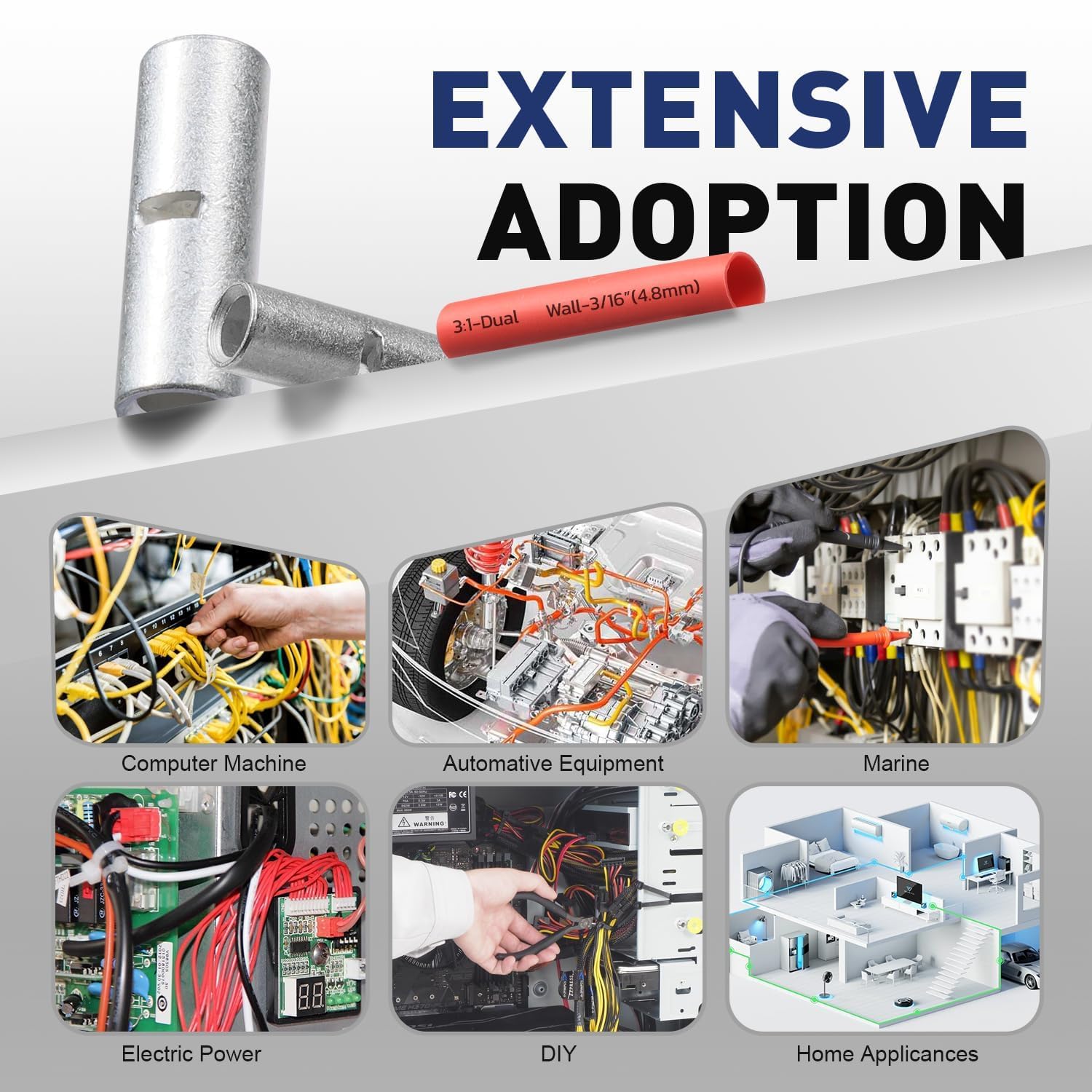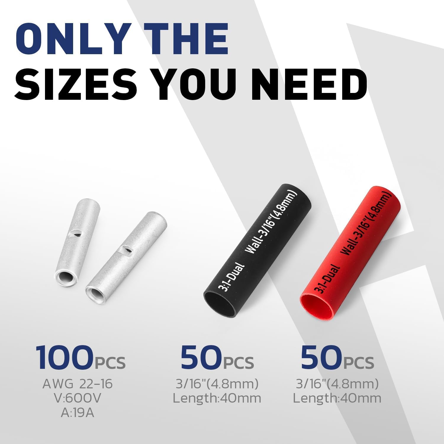 - Complete Solution: 100pcs Non-Insulated butt connectors (AWG22-16) & 100pcs 3:1 heat shrink tubing (Red/Black,) for automotive, marine, DIY and Industrial Applications