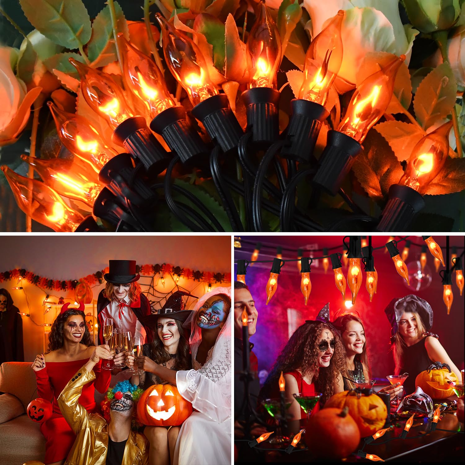- đ„ăFun Halloween Decoration Lightsă: Our Flickering Flame Halloween String Lights are perfect for indoor and outdoor decorations, the flickering flame flickers brightly in the dark night, the black vintage string light can be well hidden, suitable for use as Christmas Halloween Tree Lights, Fireplace Decorative Lights, Party Lights, Haunted House Decorations, Patio Lights, Garden Lights and so on. Let everyone immerse in the scary and fun atmosphere of Halloween together.