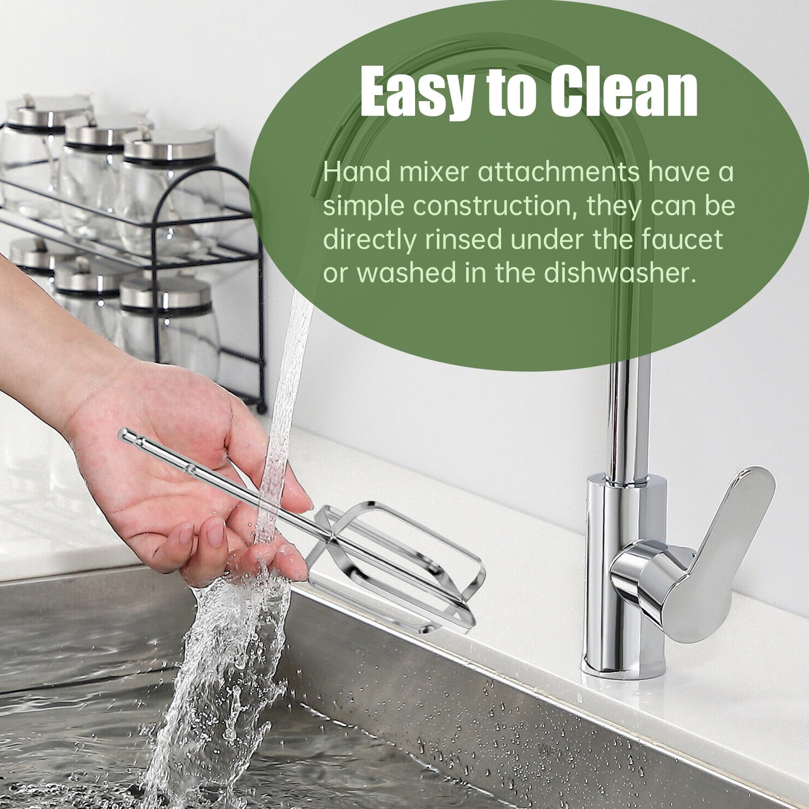 - 【Easy to Clean】Hand mixer attachments have a simple construction with smooth surface, it allows easy cleaning of food residues and can be directly rinsed under the faucet or washed in the dishwasher.