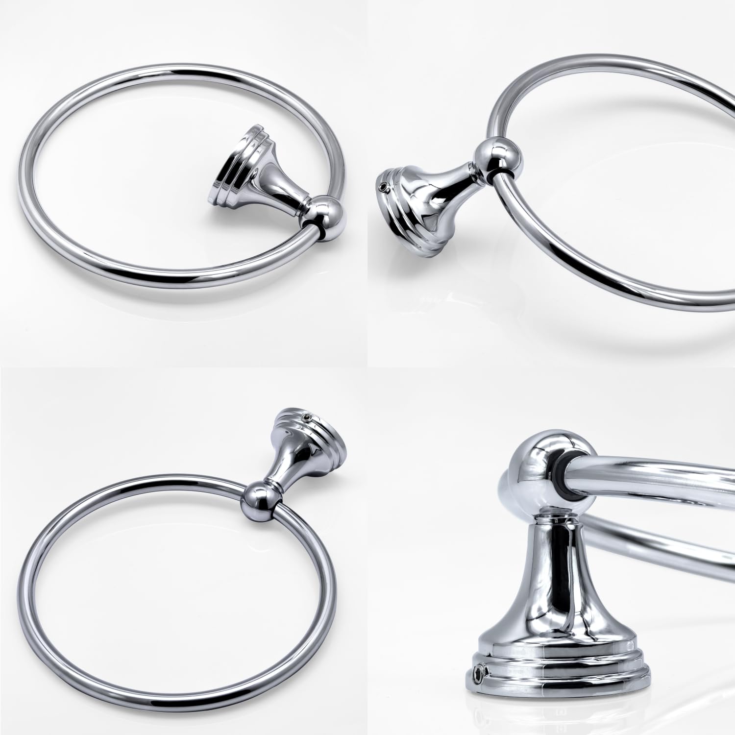 Details: Polished chrome towel ring with a sculpted base brings a bright, refined look to bathrooms and kitchens. Includes all hardware for easy installation. Rotates 180° to keep towels dry and off walls. Stable and built for daily use.