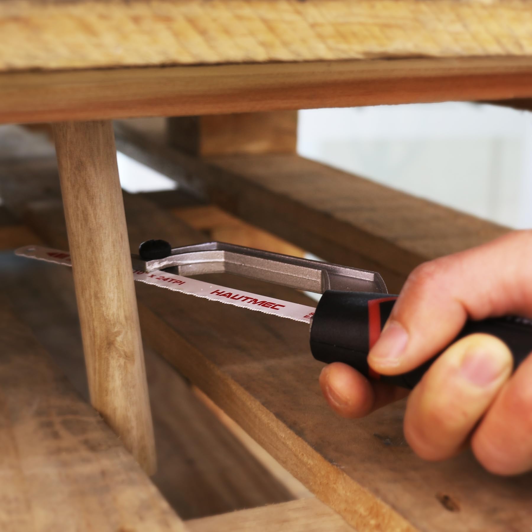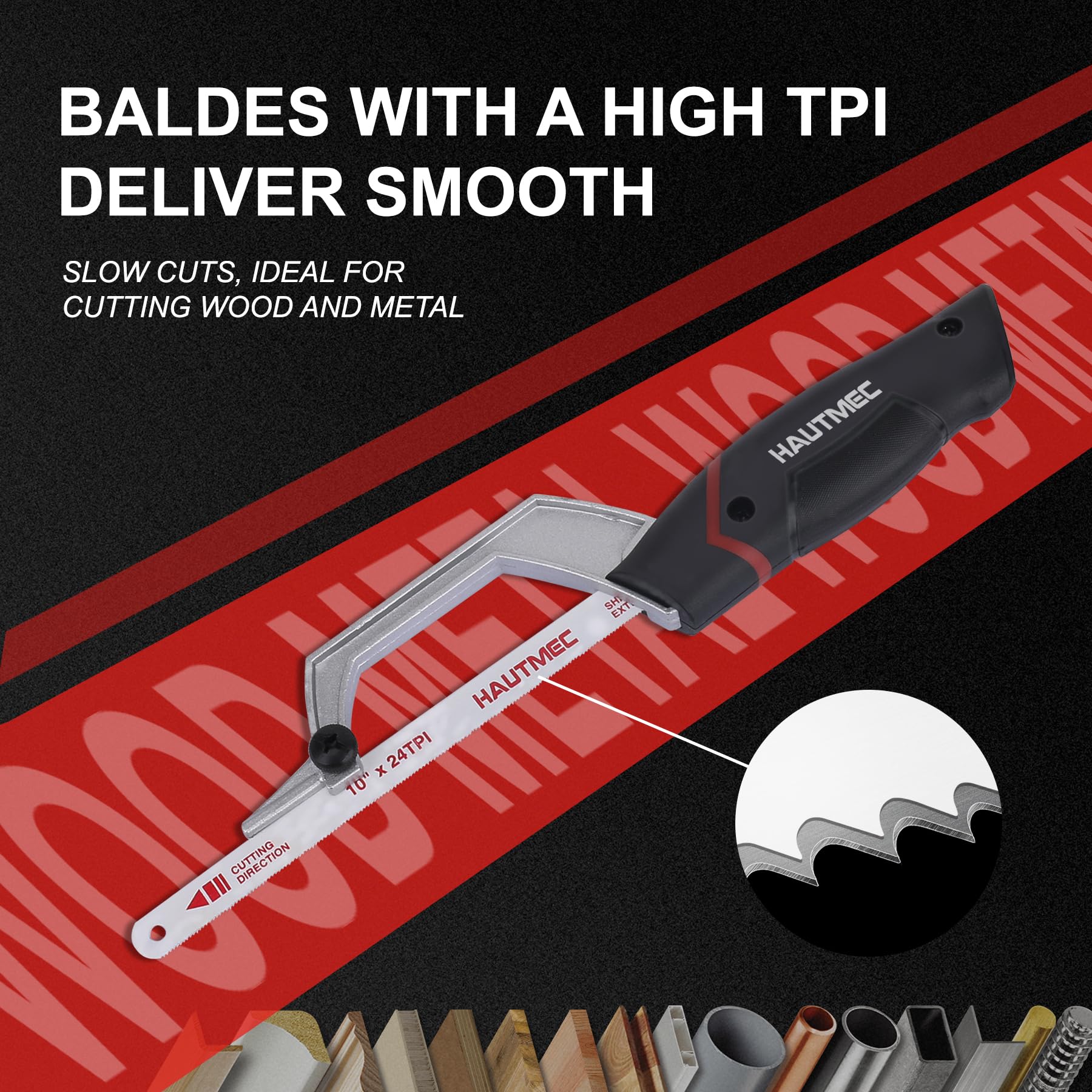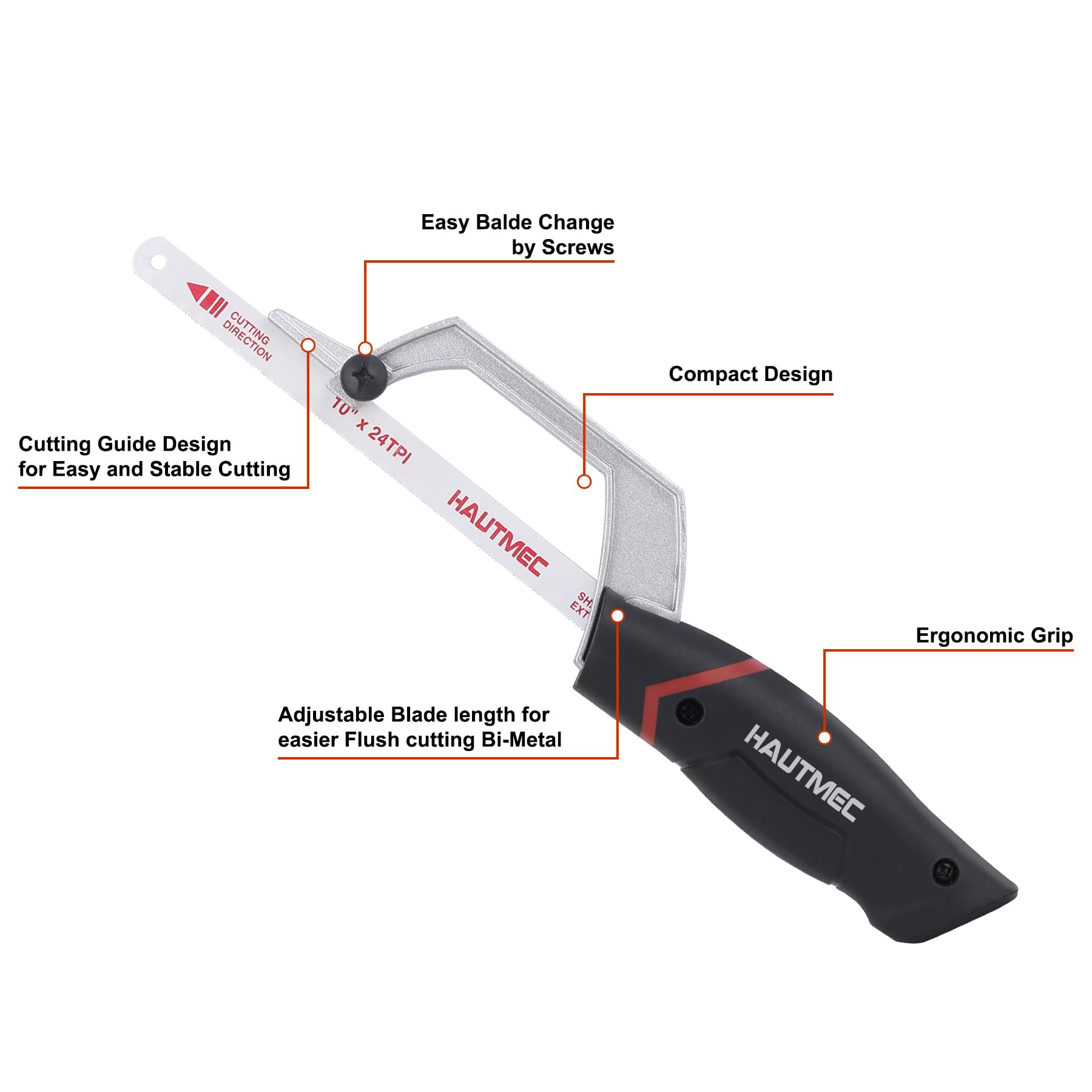 HAUTMEC Mini Hacksaw, 10" Compact Hacksaw with Cutting Guide Design, Tool-Free Blade Change, Compatible with 10"/12" Blades, Lightweight Hack Saw for Metal, PVC & Wood Cutting – HT0427