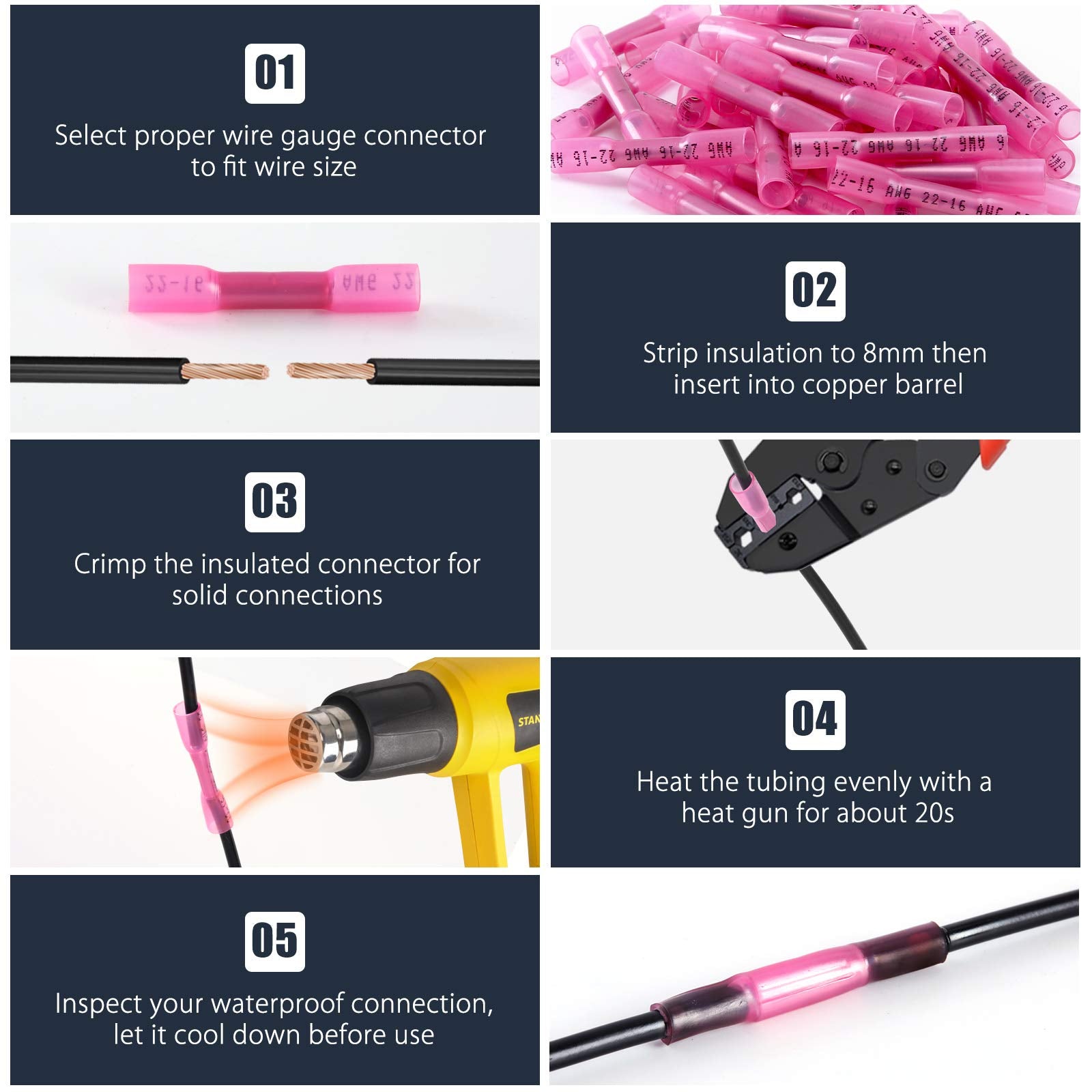 - 【MADE TO LAST】- Thanks to the thick tinned copper and seamless barrel desgin, it ensures strong and secure crimping all the time with no wire coming off issues. What's more, the polyolefin heat shrink tubing provides the high tensile strength and resistance to mechanical damage so there's no worry of rat chewing or similiar phisical damage issues. When heated with a heat gun, the adhesive melting inside create a waterproof and insulated seal, preventing electric leakage and corrosion
