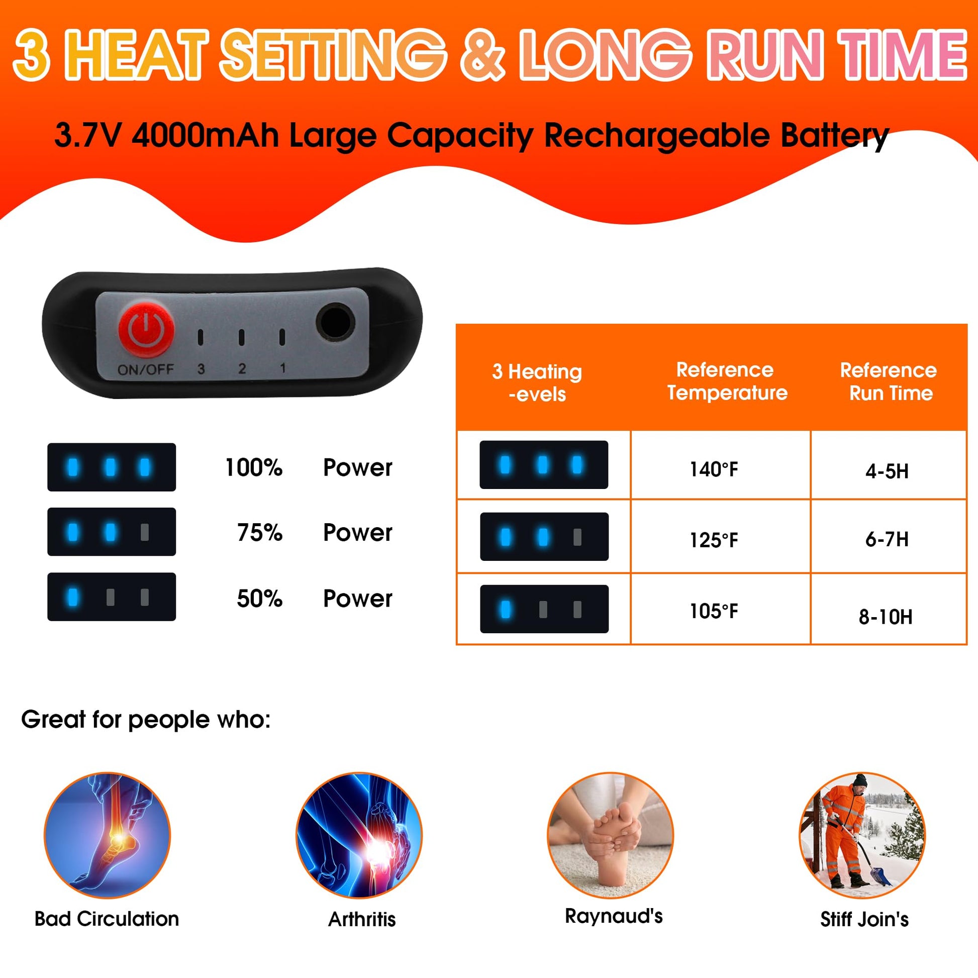- 🔥 3-Temp Settings & Long-Lasting Battery Life: Equipped with dual 4000mAh rechargeable batteries, these socks provide up to 10 hours of warmth on the low setting. Three adjustable heat levels (up to 140°F) let teens choose the right warmth for skiing, hiking, camping, or everyday cold weather.