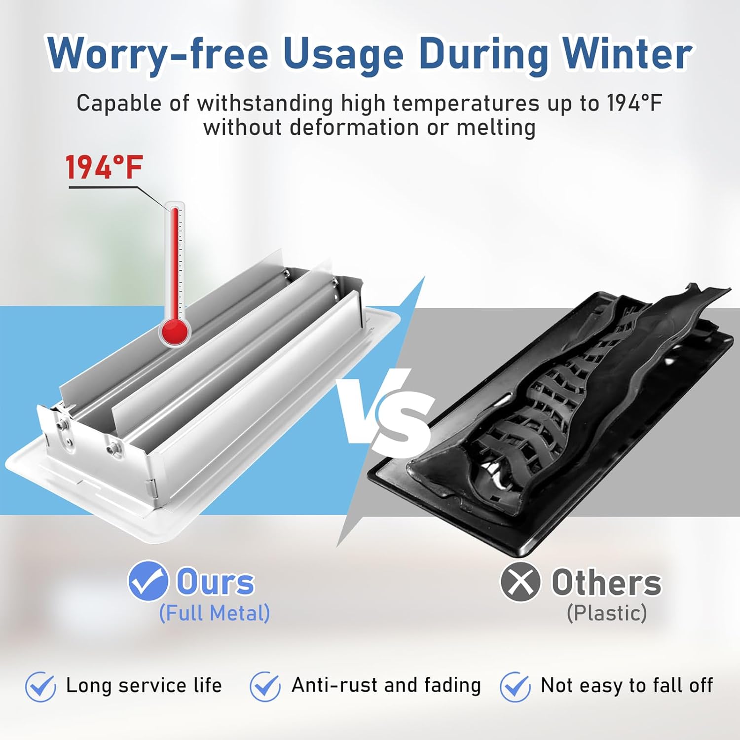 - Full Metal Material: The whole vent is made of sturdy metal, these vent covers are ideal for use with air conditioning, cooling, and heating systems. They feature a rust-proof coating, ensuring long-lasting durability and maintaining their original condition in various environments, and worry-free usage during winter