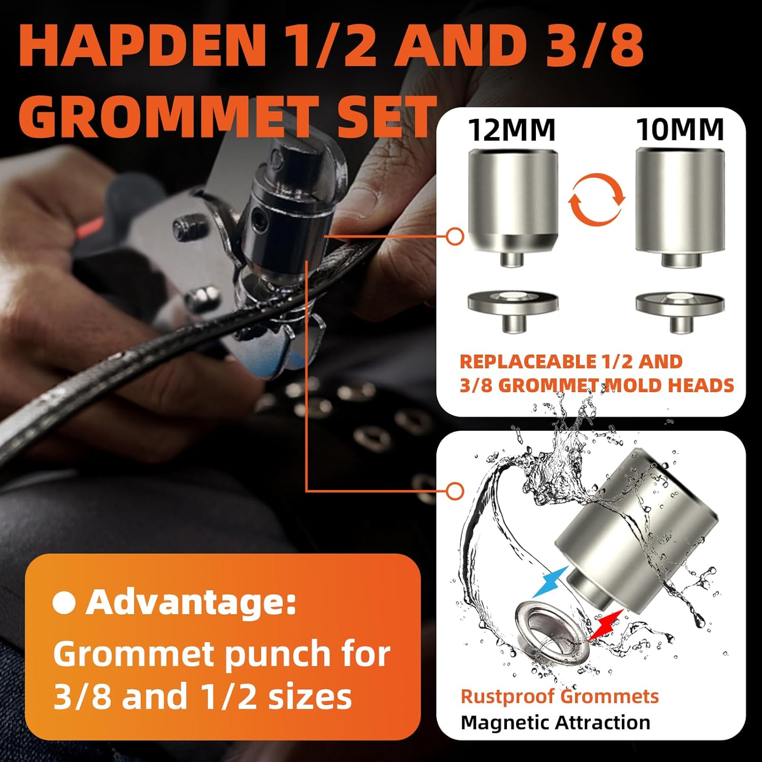 - Flexible use: HAPDEN grommet maker kit doesn't require pre-drilling before use. If you need to hole punch, grommet setter kit comes a hole puncher and a white backer block.