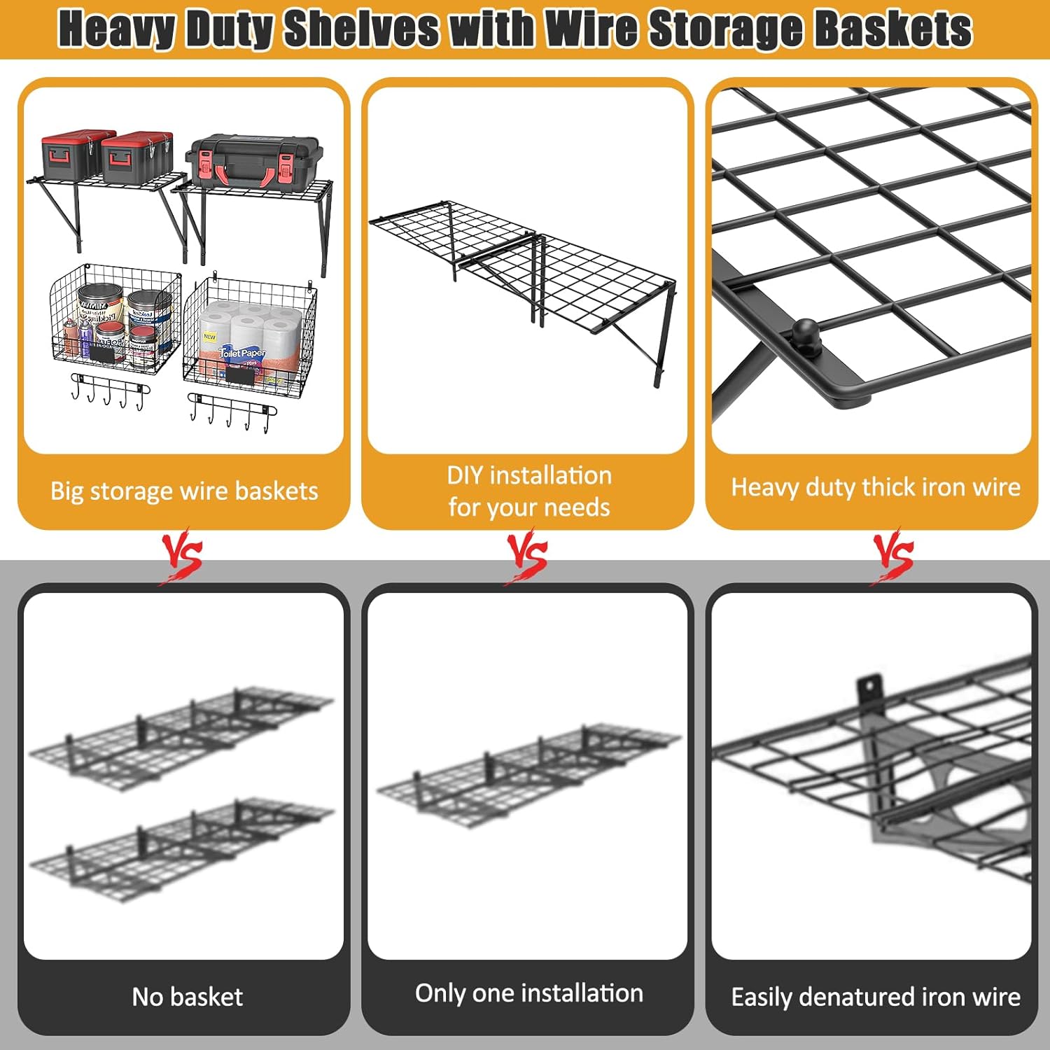 - LARGE STORAGE CAPACITY: The package includes 2 shelves, 2 wire baskets, 2 hook racks, and 4 hooks. This unique storage combination has a large enough capacity to store a lot of garage supplies. Making full use of this shelving capacity to make your home look cleaner and tidier.
