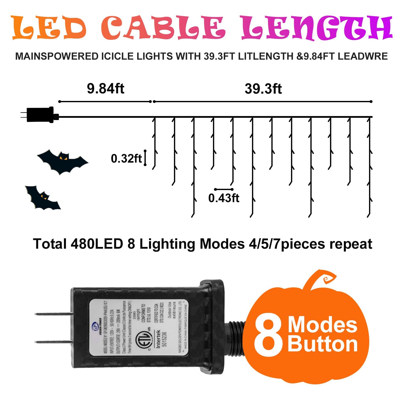 - Purple and Orange Halloween Lights: 39.3ft string features 480 LEDs with 90 drops, with a 9.84ft plug lead for easy setup. Enjoy 8 lighting modes, plus timer and memory functions. ideal for creating a spooky ambiance for haunted houses or parties