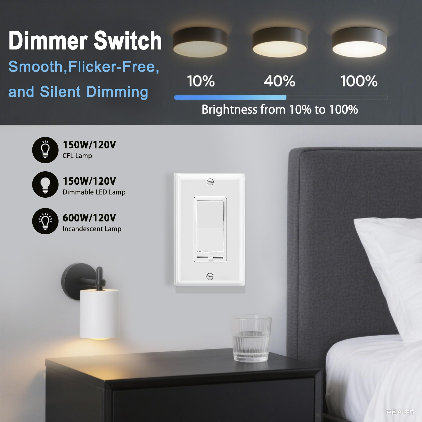 - Our dimmer switch enjoys smooth, flicker-free adjustment of light brightness through sliding control to avoid unnecessary waste of energy.