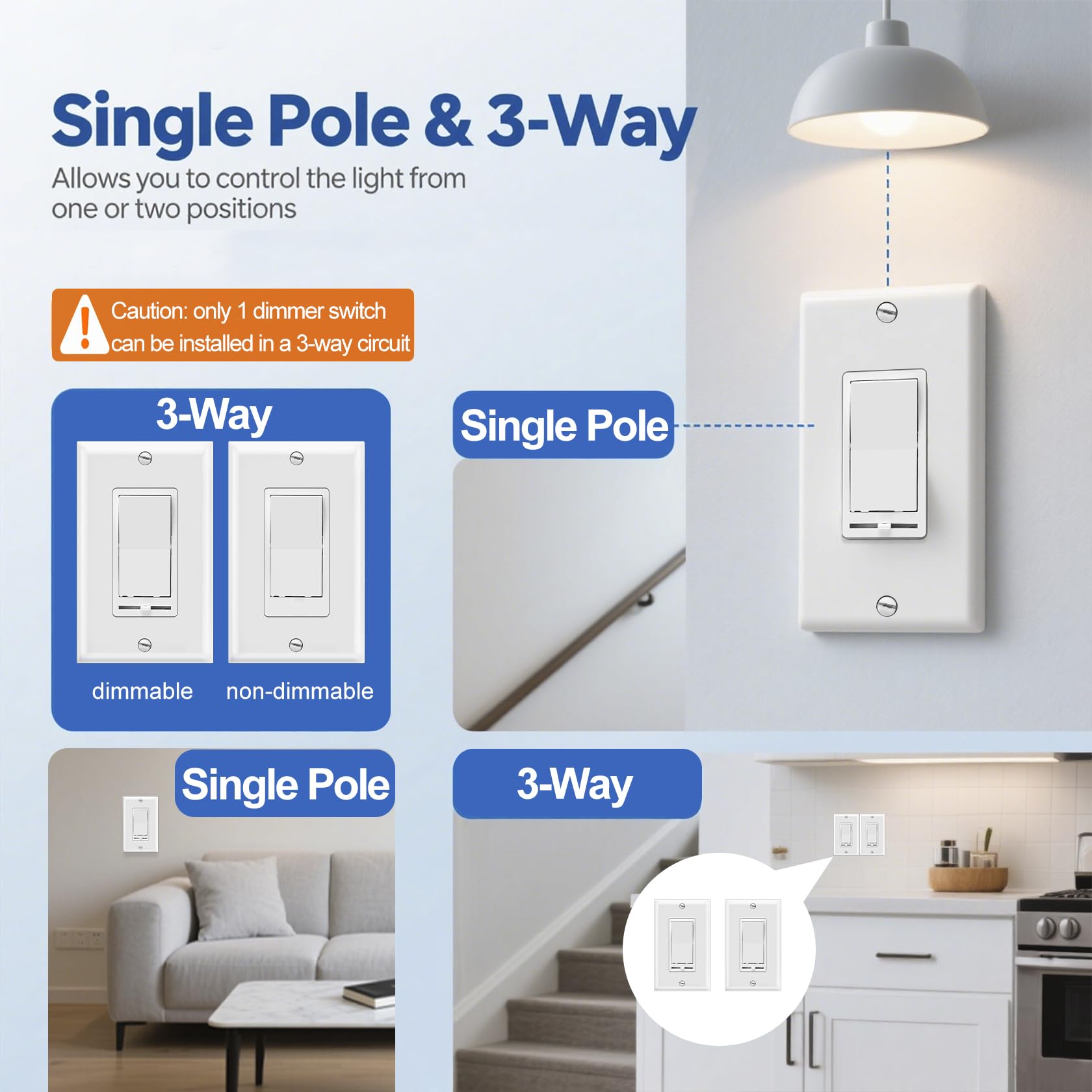 - Our dimmer is compatible with 3-way or single-pole switches and can easily adjust the light brightness. Whether you want to create a romantic and warm atmosphere or need a bright working environment, this dimmer can meet your needs.