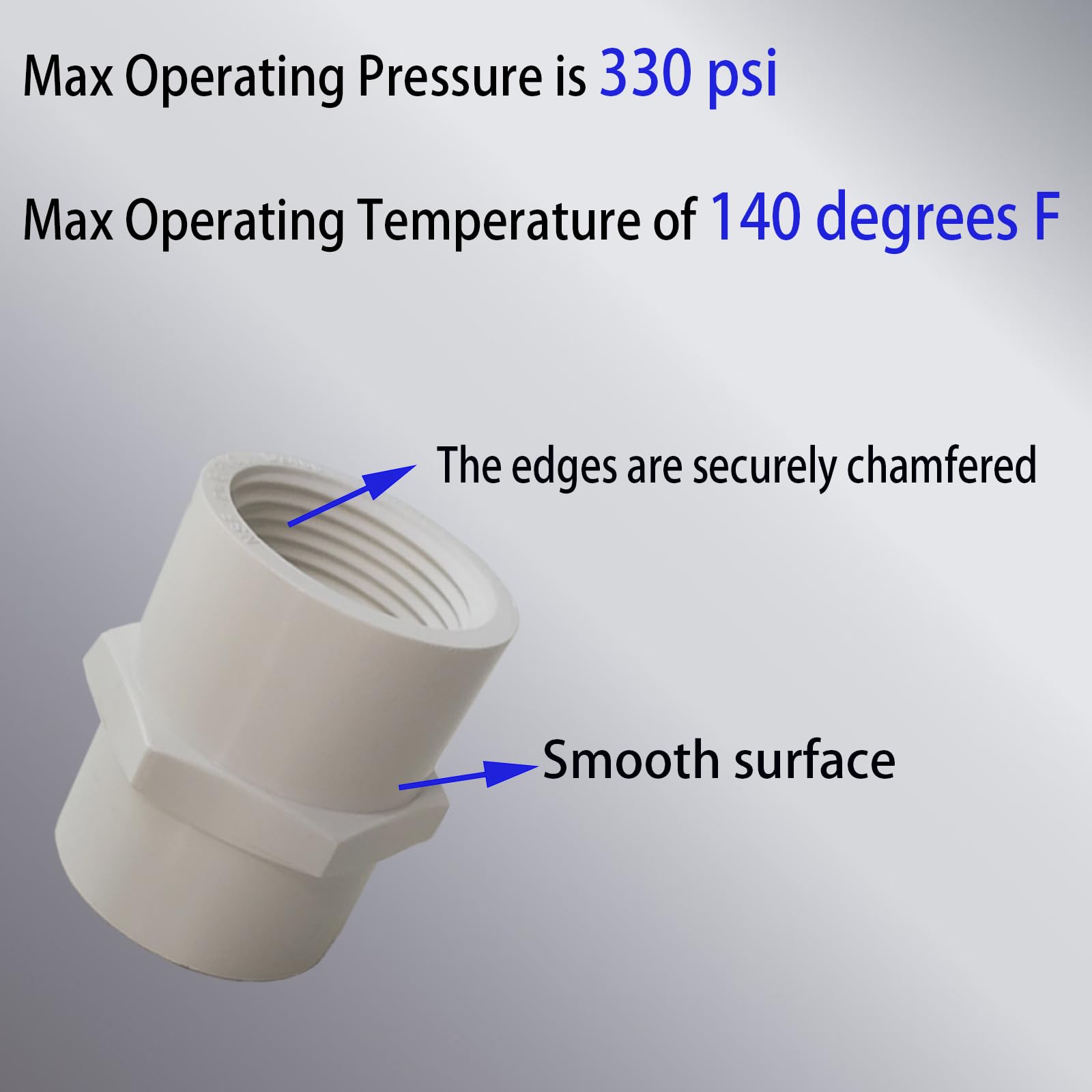 - PVC Pipe Coupling : 3/4 inch NPT Female Thread PVC Pipe Fitting with slip opening on one end and female NPT threads on the other for connecting to pipes with different ends. Our PVC Slip Socket Connectors Max operating pressure is 330 psi, Max temperature is140° F (60° C).