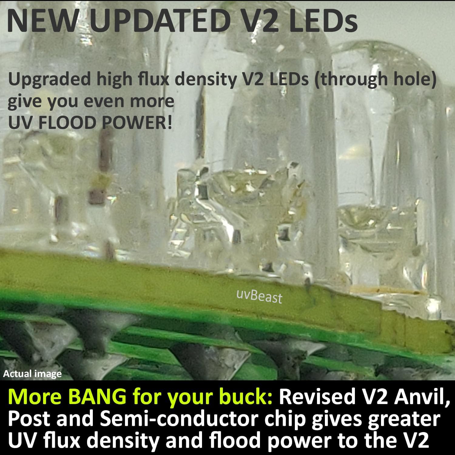 - EVEN MORE POWER. **UPGRADED New V2 LED chips (through-hole) for 2020/21. Unlike others we’ve pushed the envelope. Larger newer LED chips makes the uvBeast even more of a monster. The UV output is even more awesome than before, so we’ve included glasses with great optics to tame this beast a little!