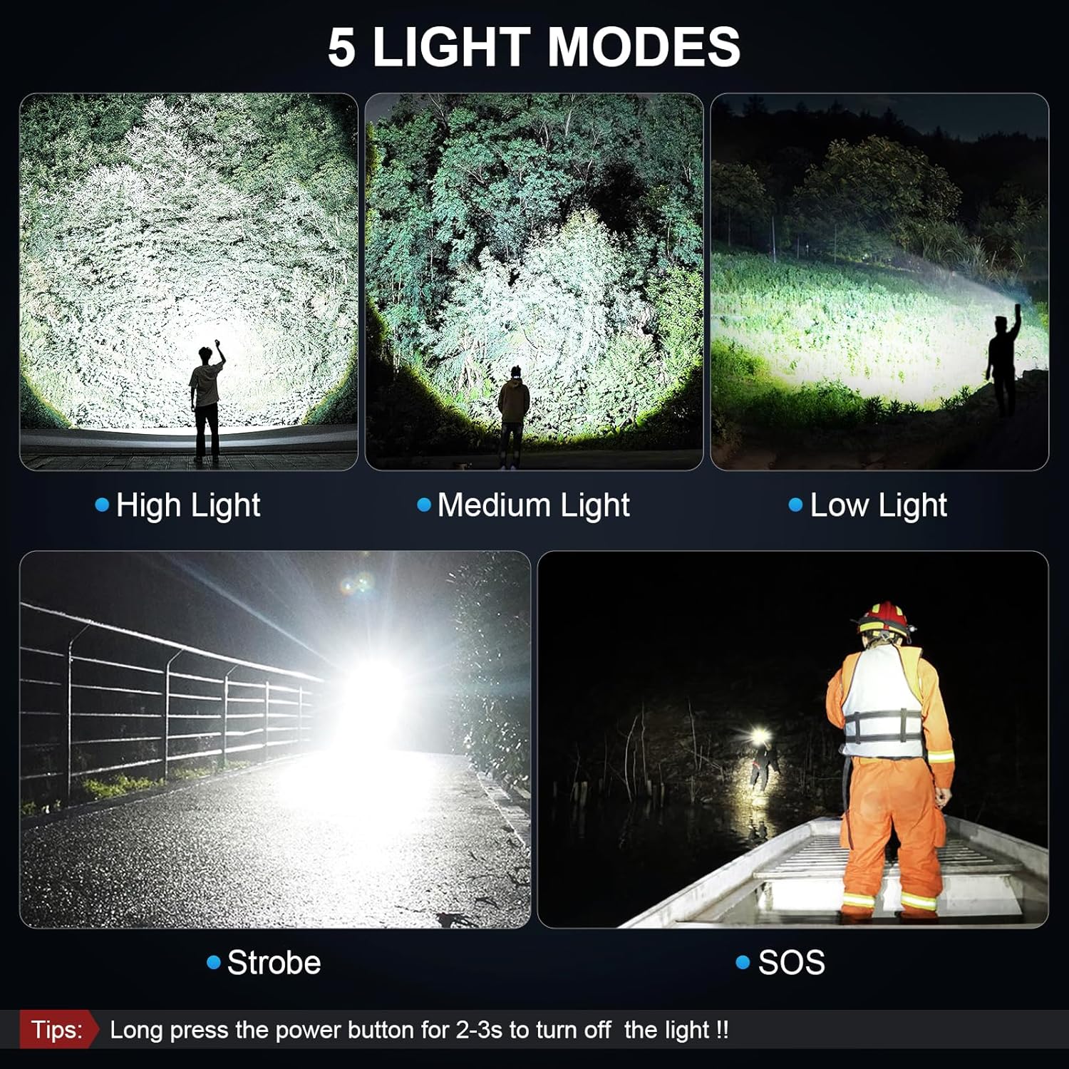 - 【Flashlights High Lumens】Rechargeable flashlight updated P90.2 Chip can generate up to 99000 lumens light output. High powered flashlights illuminate over 3280 ft through deep darkness, fog. ΒATTERY life of up to 1,000,000+ hours, perfect for home, dog walking, hiking, camping, and outdoor adventures