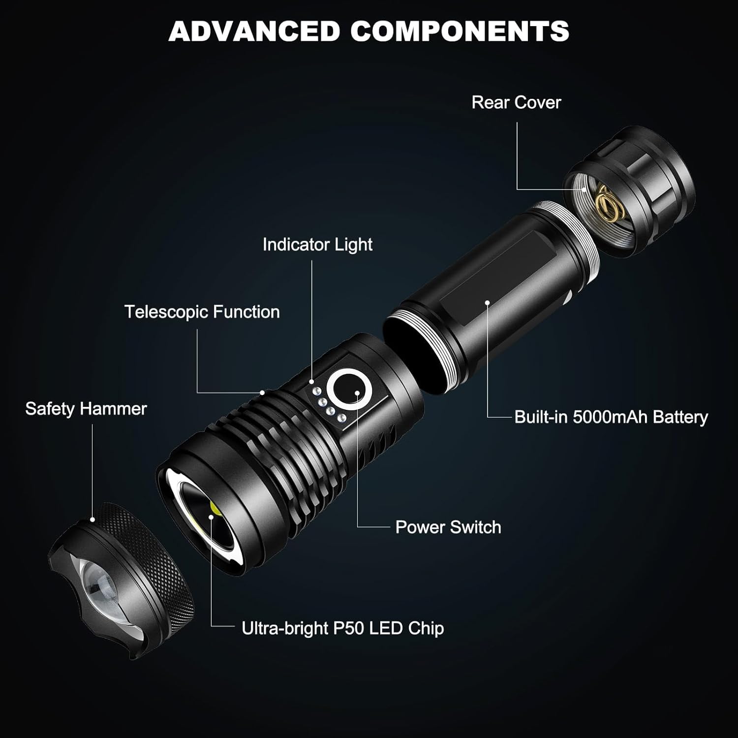 The super bright flashlight has built-in upgraded Long Beam LED Chip, which produces a powerful and focüsed beam, the max output of 90,000 lumens, can shine up to 3280 feet. Ideal for special needs such as field search, sea rescue, long-distance instructions, etc.