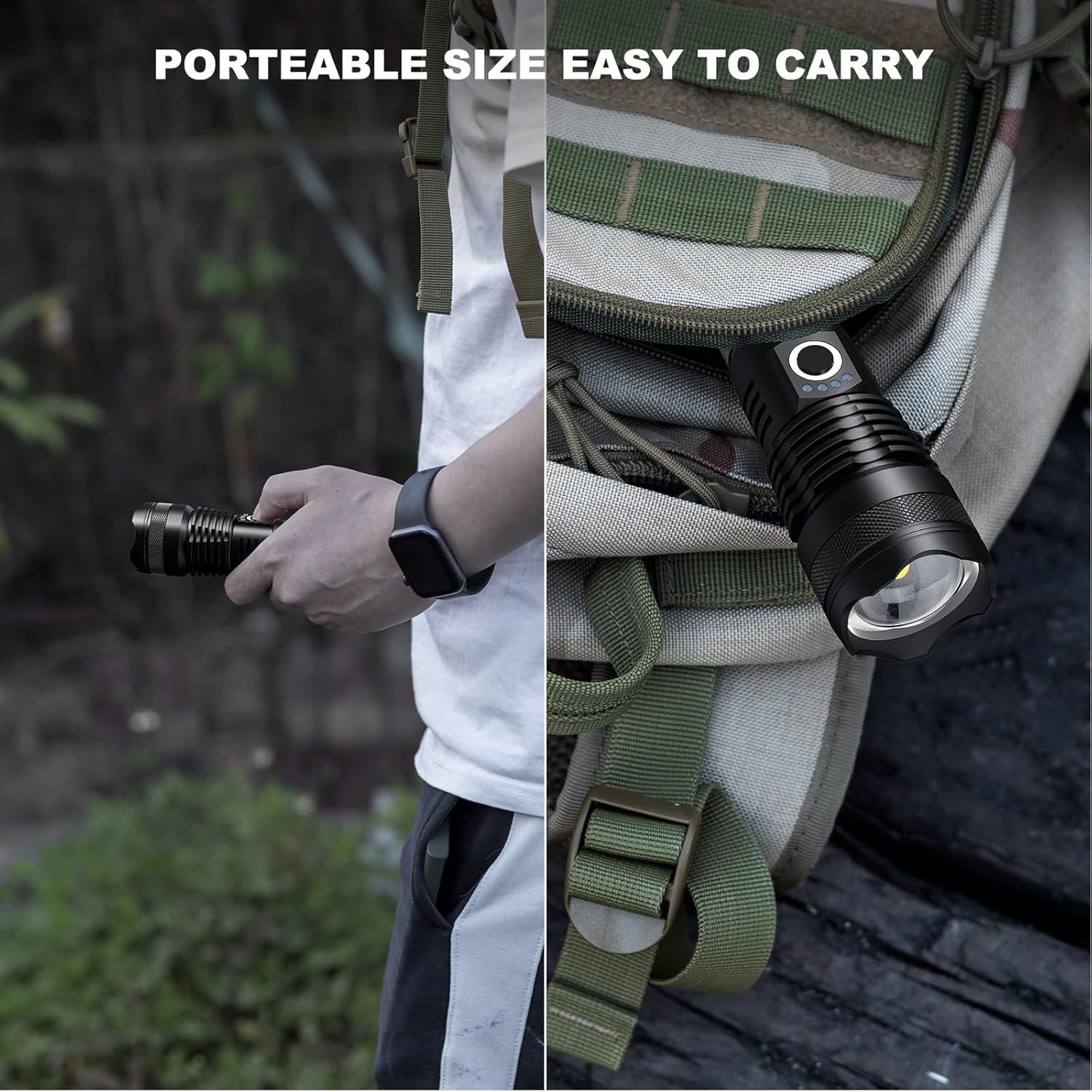 - 🔦【3 Hours Charging Time】Rechargeable flashlights feature with input charging interface and built-in fast charging chip. It can be charged from power banks, car chargers, outlets and laptops using the standard USΒ-C charging cable (included).flashlight.