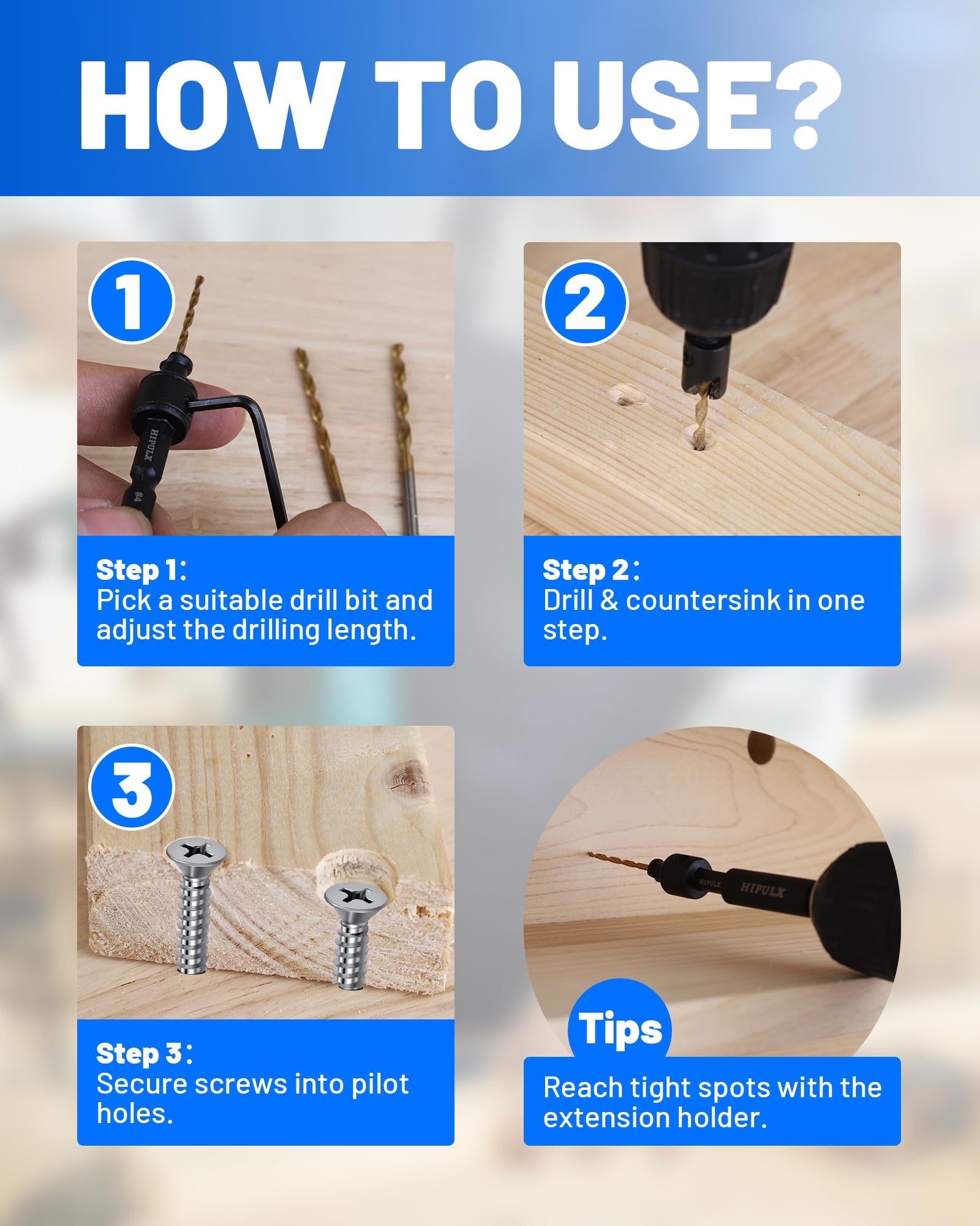 - DESIGNED FOR You: Features premium Titanium-coated HSS pilot bits that resist breakage. Loosen set screw to adjust twist drill length or clear chips.→ Match exposed bit length to screw depth.→ Tighten screw; drill through joined wood in one go.→ Drive screw flush into the pilot hole.