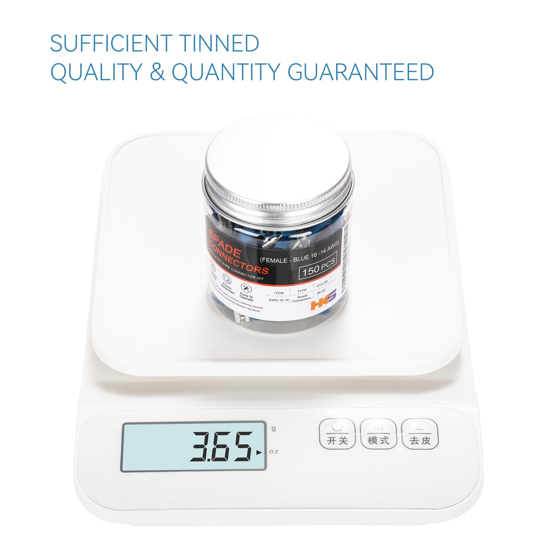 HKS 150PCS Blue Female Vinyl Insulated Spade Connectors, 16-14 AWG (1.5-2.0 mm²) Quick Disconnect Terminals, 4.8 mm (3/16") PVC-Sleeved Tinned Brass Wire Connectors Kit