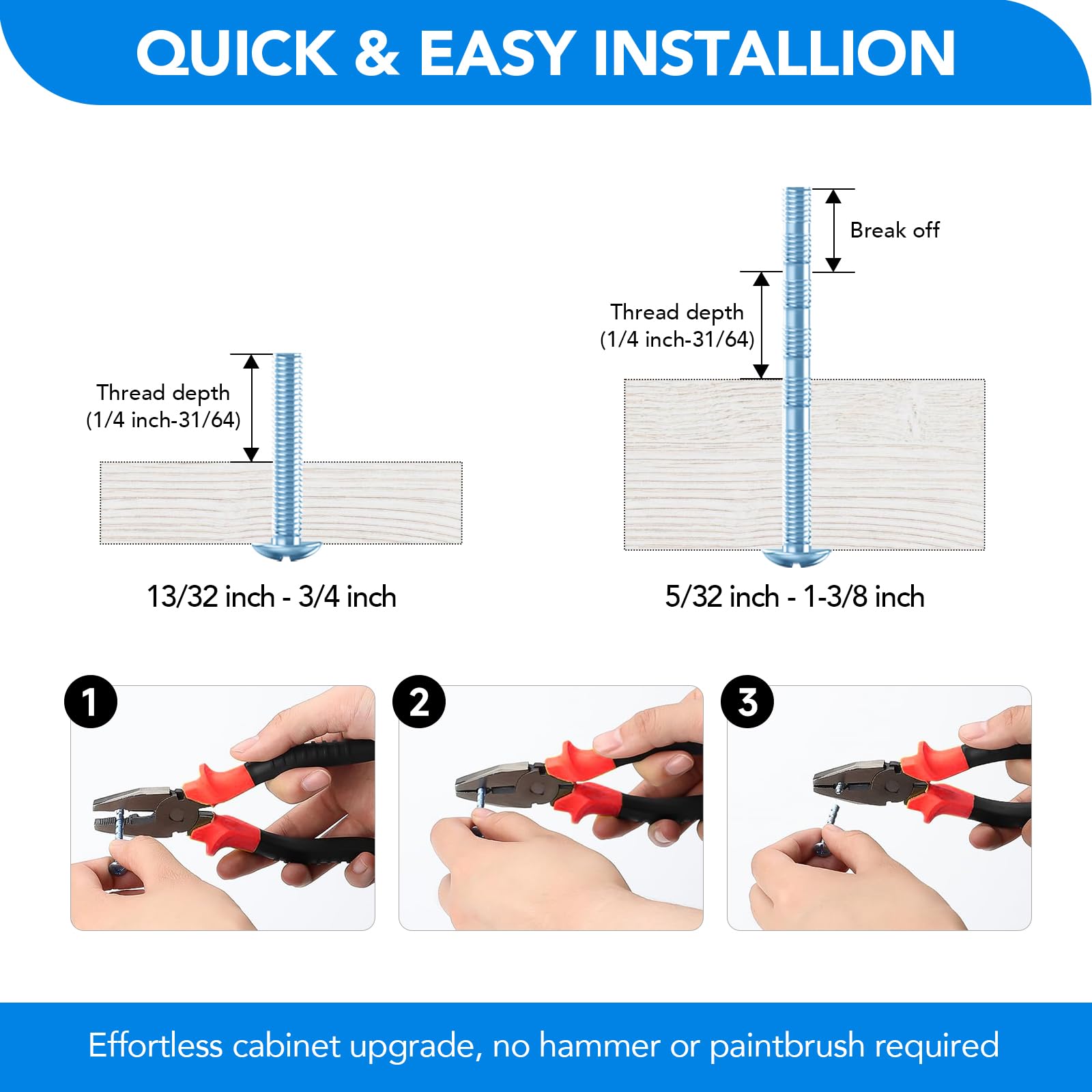 - Installation: Make holes at the desired locations for your kitchen cabinet hardware based on the hole center. Insert the screw from the backside of the board and secure it to the cabinet handle