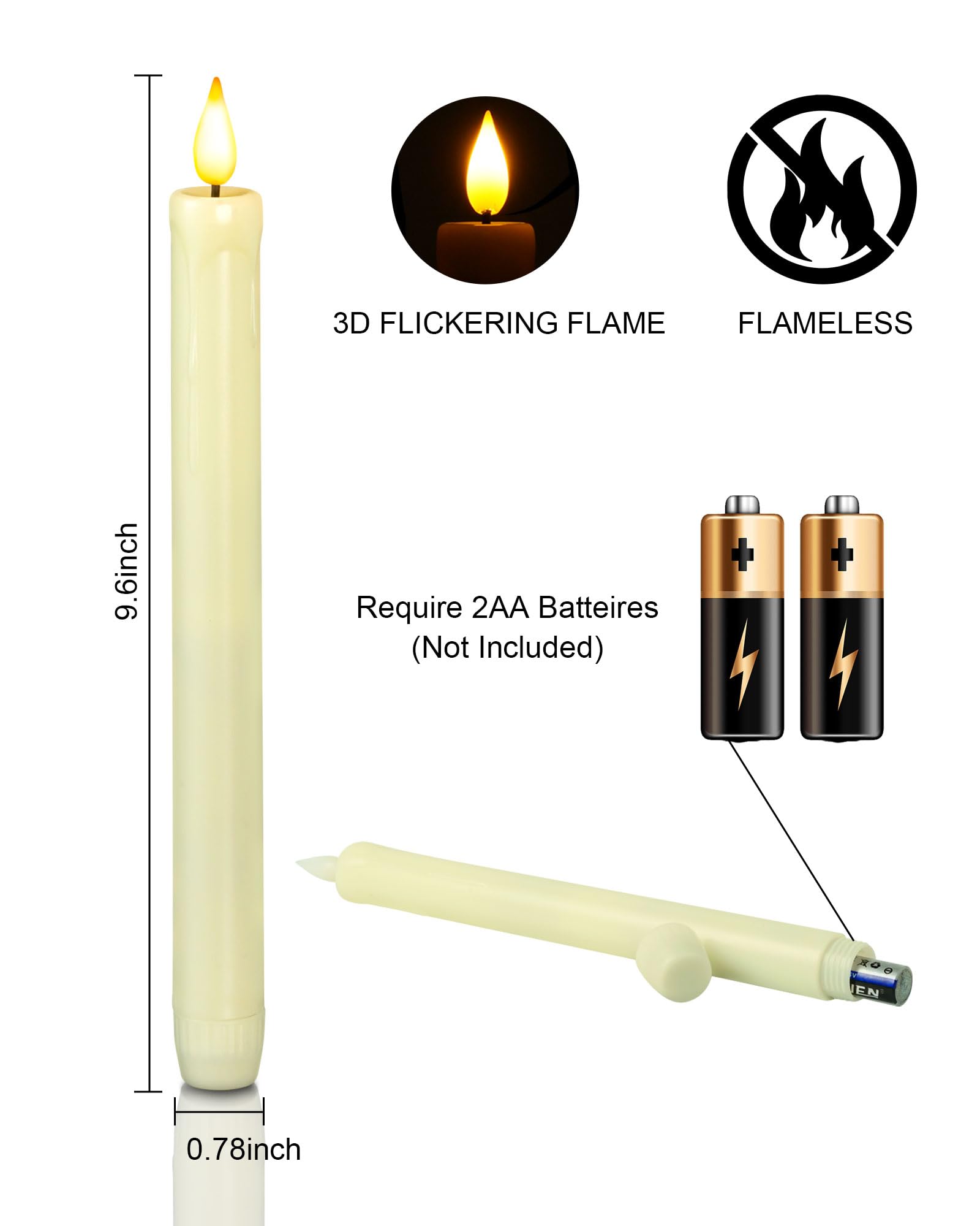 - Perfect Size for Most Candle Holders: This set includes 2 flameless taper candles (batteries not included), each measuring 9.6 inches in height and 0.78 inches in width. Designed to fit most standard candle holders, they are ideal for centerpieces, chandeliers, and decorative displays. Pair them with traditional brass holders or modern glass candle holders to add a warm and elegant touch to your home decor.