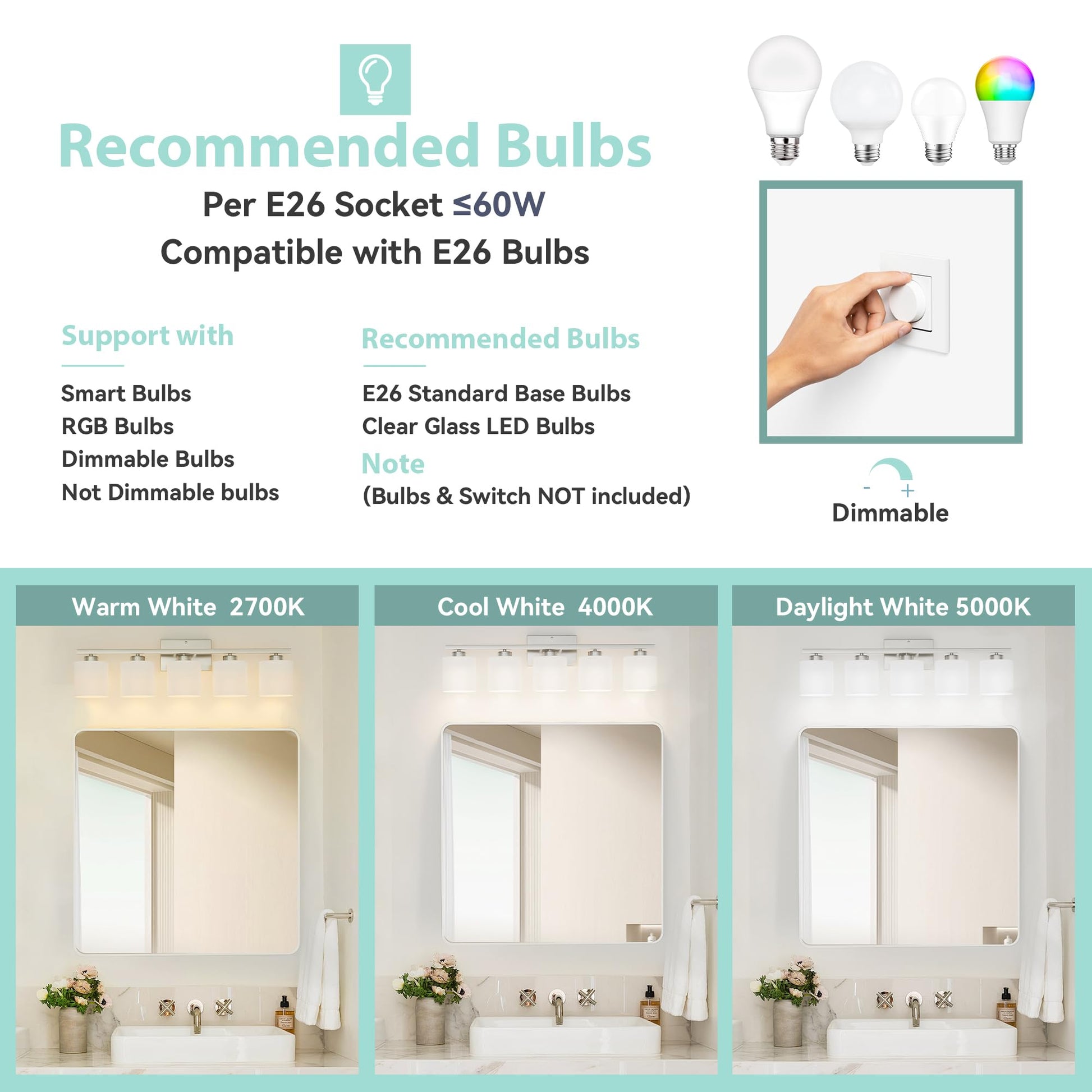 - 【E26 Standard Sockets Bathroom Vanity Light】The Honesorn 5 light bathroom light fixtures have E26 standard sockets, and you can use them in a max 60 watt or lower energy bulbs on 120V. Standard socket bulbs are straightforward to find in the market, so you don't need to worry about that. These bathroom lights over mirror also work well with dimmers and are compatible with the smart bulbs, rgb bulbs, dimmable and not dimmable bulbs. Please note that the LED bulbs have not come with the package.