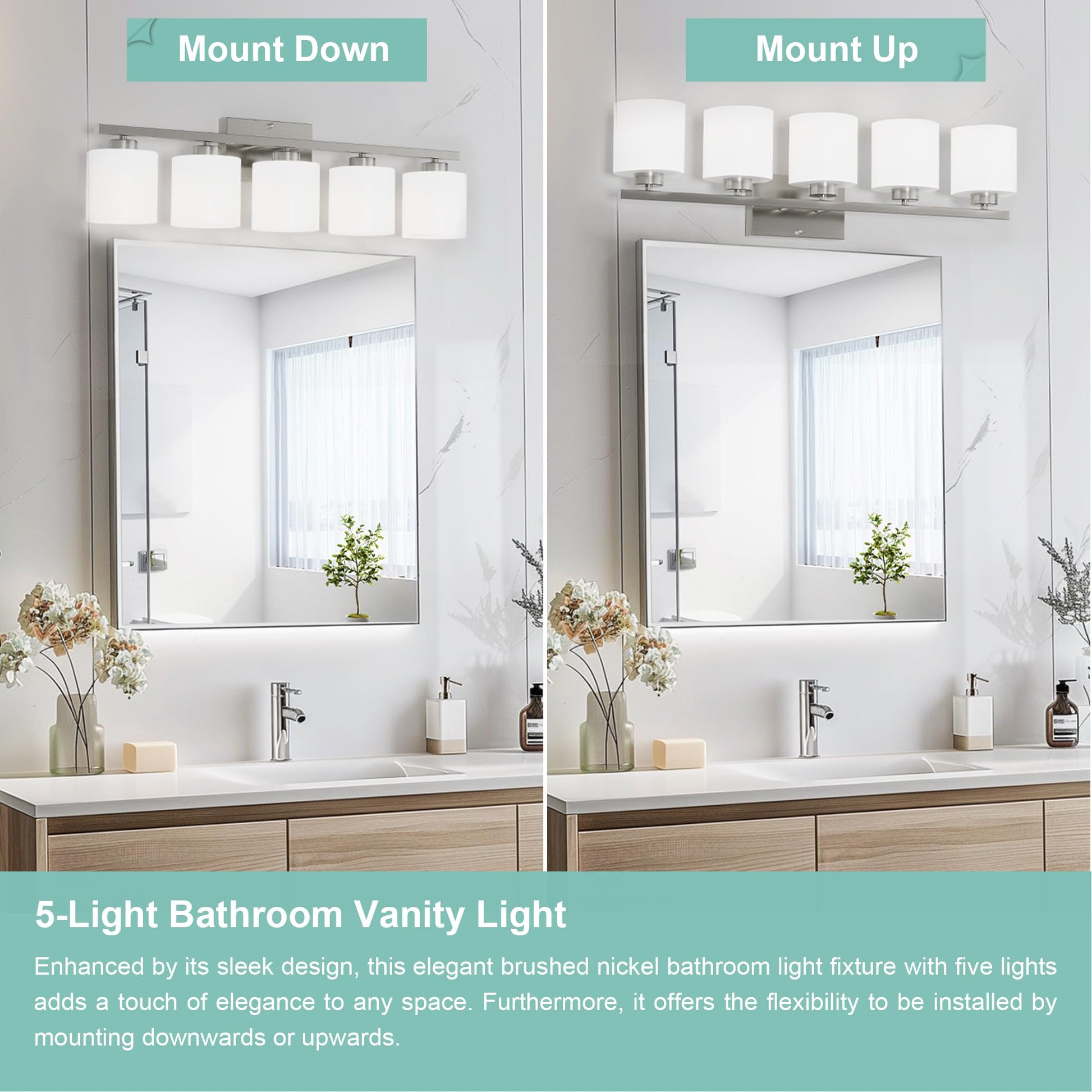 - 【Modern Bathroom Lights over Mirror】The brushed nickel vanity lights fixture and shades are made of solid material with 5 of thick glass shades, not plastic, and the white frosted shades help with brightness, providing you soft light instead of a harsh glare. The vanity lighting fixtures are lightweight but are not as delicate as you feared! The contemporary look bathroom light fixtures featured steel construction for long-lasting use and saved you the trouble of frequent replacement.