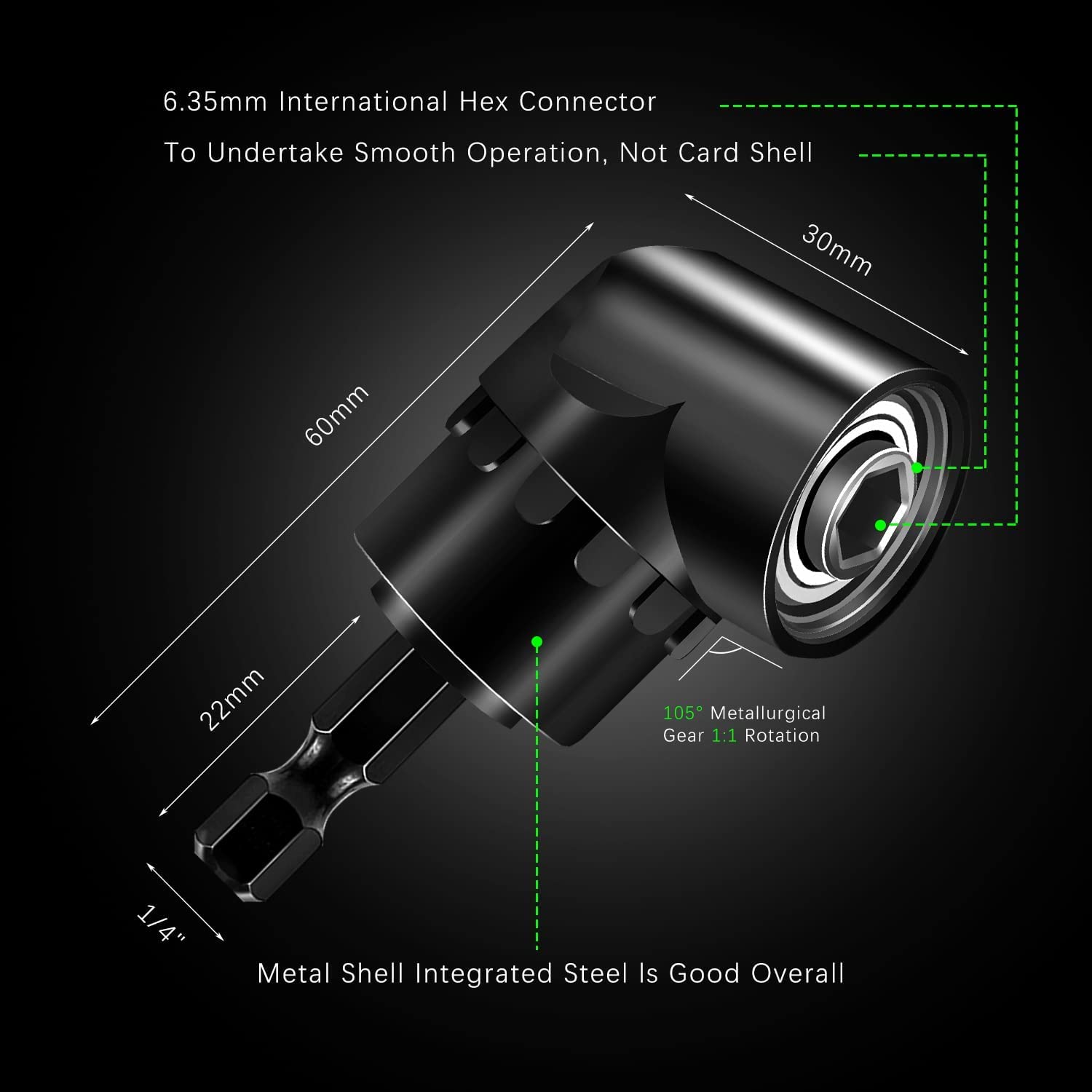 - ☞High Quality:105°Angle Extension Made of Chrome Vanadium steel, high hardness angle drill bit holder, anti rust, durable die cast body with 3 ball bearings for long life [Strong Magnet] Built in strong magnet for good holding power, this right angle drill attachment is easy to use and avoid falling off [Easy To Use] 105 degree angle extension, 360° parallel adjustment, perfect handy tool for hard-to-reach corners and tight spaces, max torque 15n/m