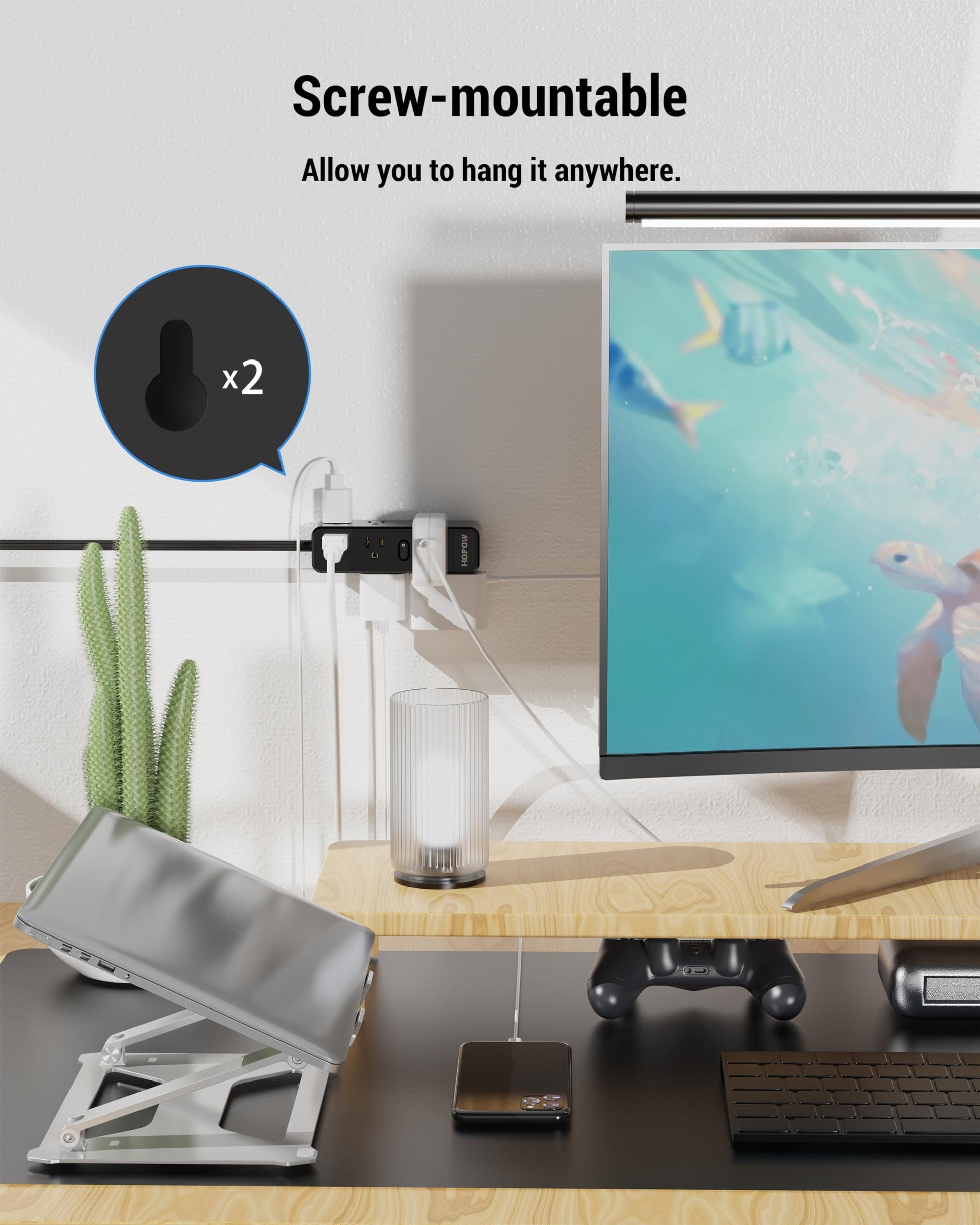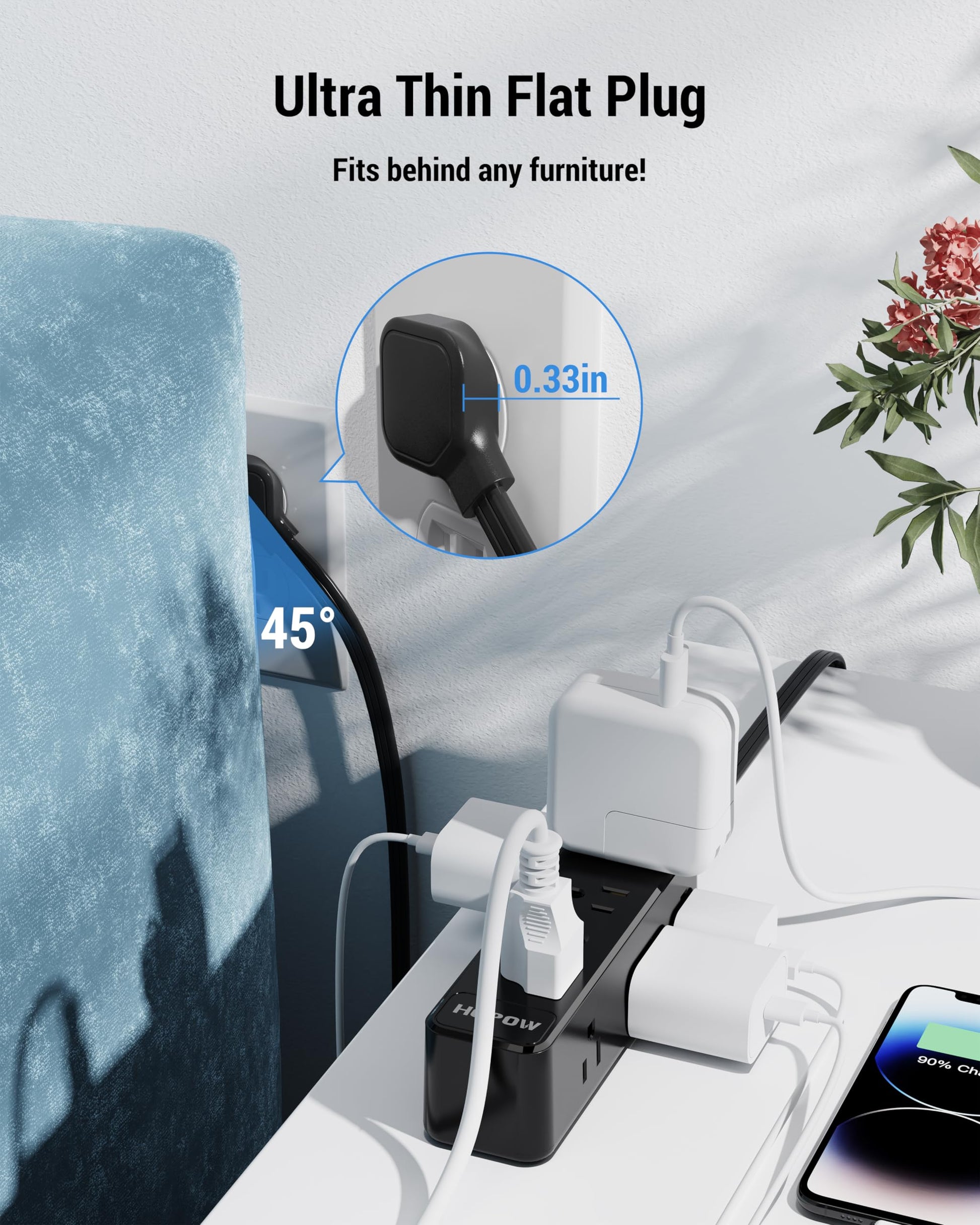 - 【Wall-Mountable & Anti-Slip Feet】Designed with 2 mounting holes, this black multi plug flat plug power strip can be mounted on any wall. It also has 4 rubber feet on the bottom of the desktop charging station prevent slipping and can be secured in place.