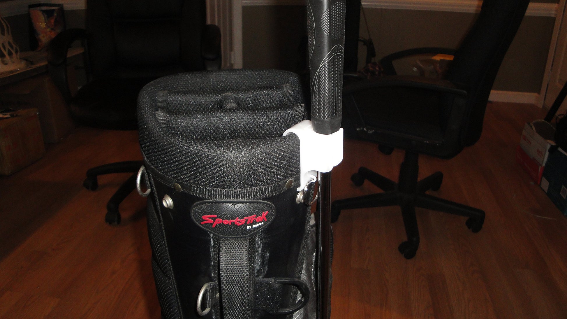 - Holds putter on bag with the grip pointing up, while riding on a golf cart.