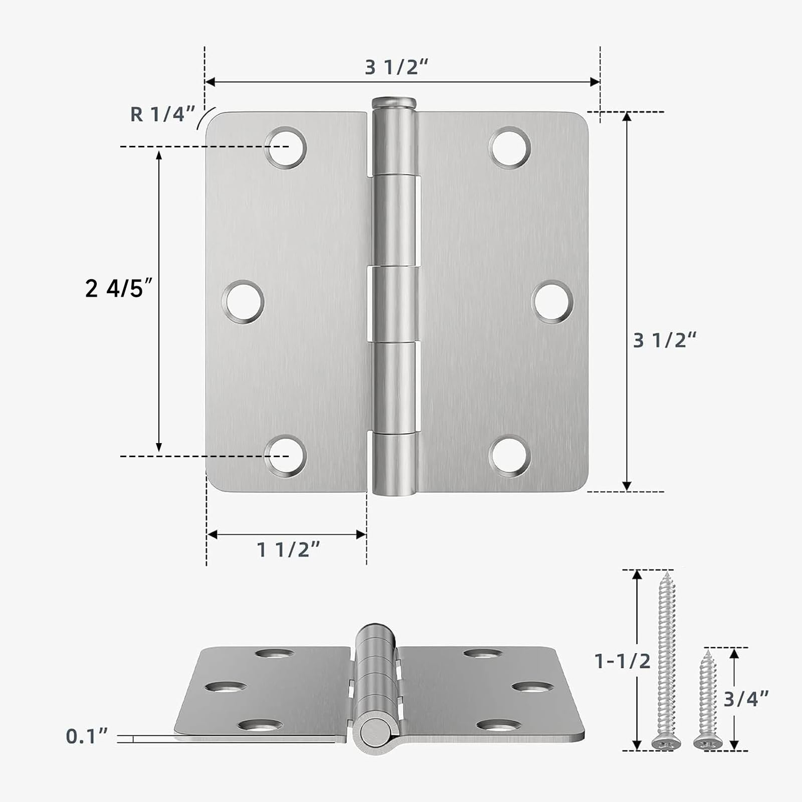 - 【Complete Set】 The package includes everything you need : 3 standard 3.5'' interior door hinges with 1/4'' radius corners and 6 screw holes, #9 3/4'' screw x 18 & #9 1-1/2'' screw x 1