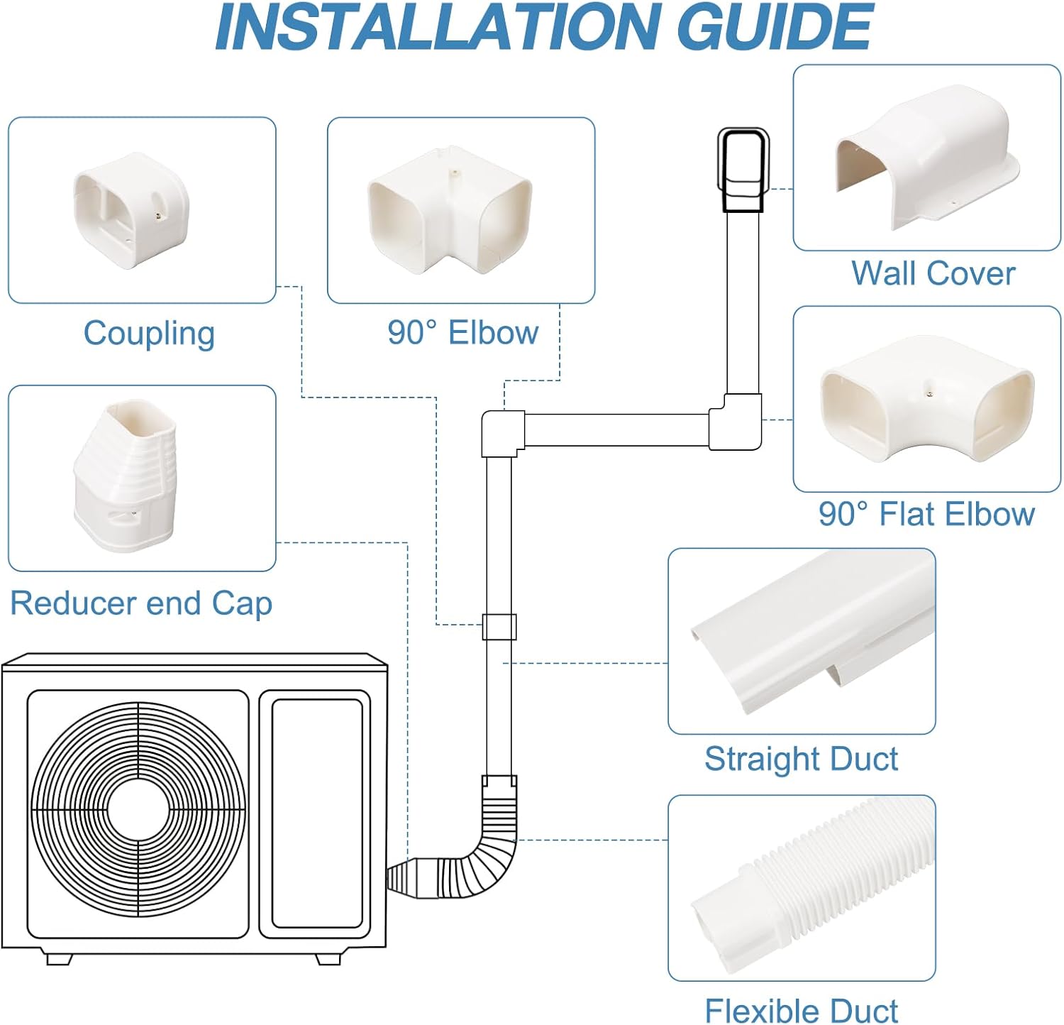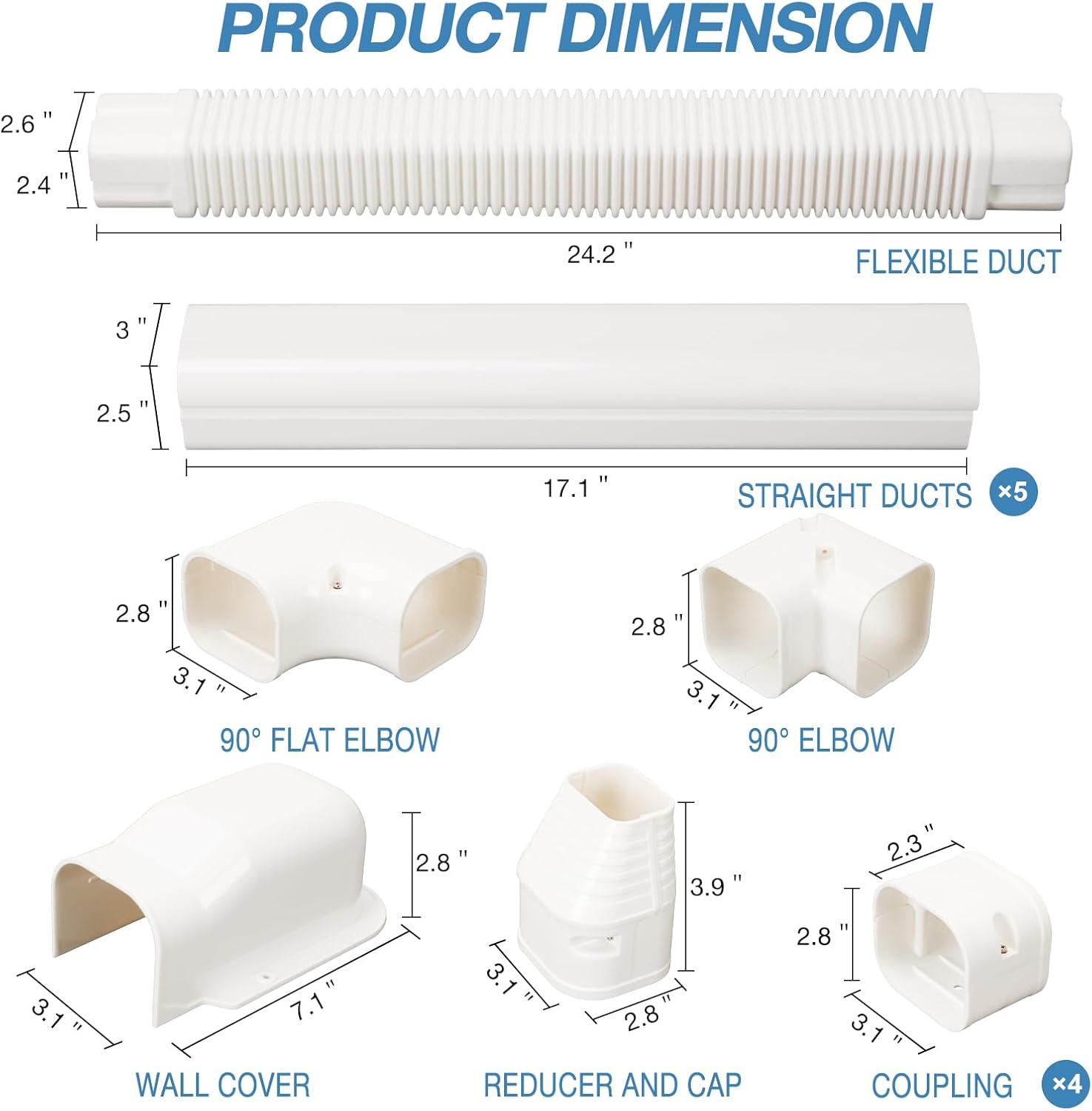 - 【Great Value Set 3“*10Feet】Our line cover is totally sized with 3’’*9 feet, including 5*1.41 feet straight ducts+1*2 feet flexible ducts, longer than similar products in the market. This PVC line set also includes most integrated parts, more parts than others. With our combination, no need to buy other parts separately.