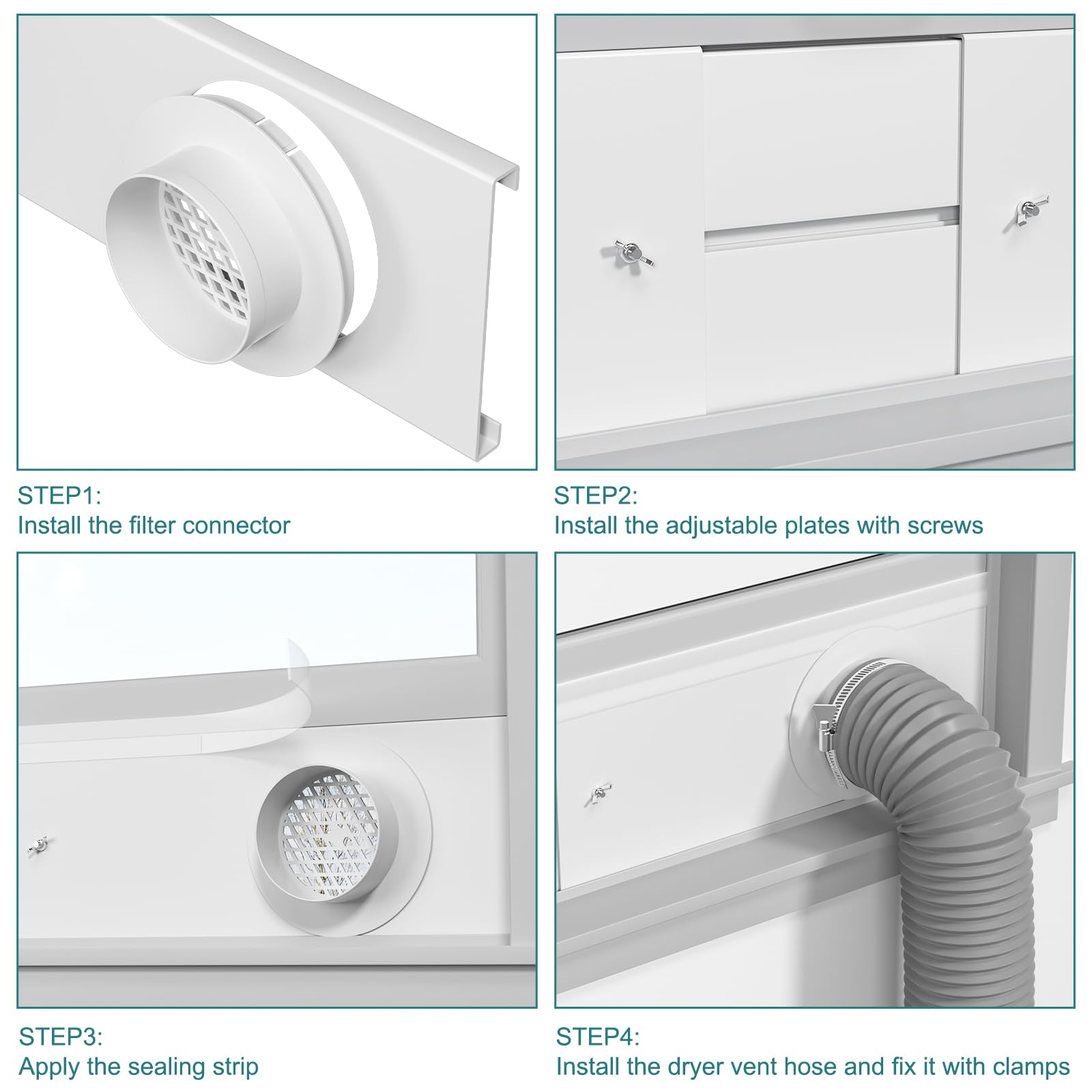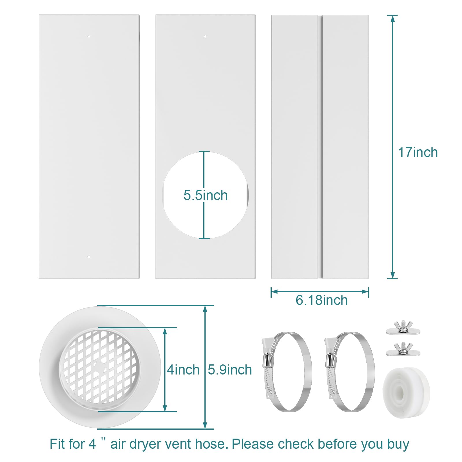 - WINDOW DUCT KIT: HOXHA dryer window vent kit includes 3 plates, 4" diameter coupler with filter, 1 sealing strip, 4 screw accessories, 2 hose clamps (THIS KIT WITHOUT DRYER VENT HOSE), applies to dryer 4 inch vent hose.