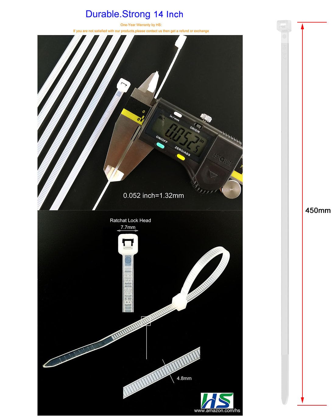 HS 14 Inch Zip Ties White 50 Pounds Tensile Strength Wide Straps (100 Pack) Nylon PA66,Self-Locking Long Electrical Plastic Cable Wire Zipties for Outdoor Use,Multi Purpose