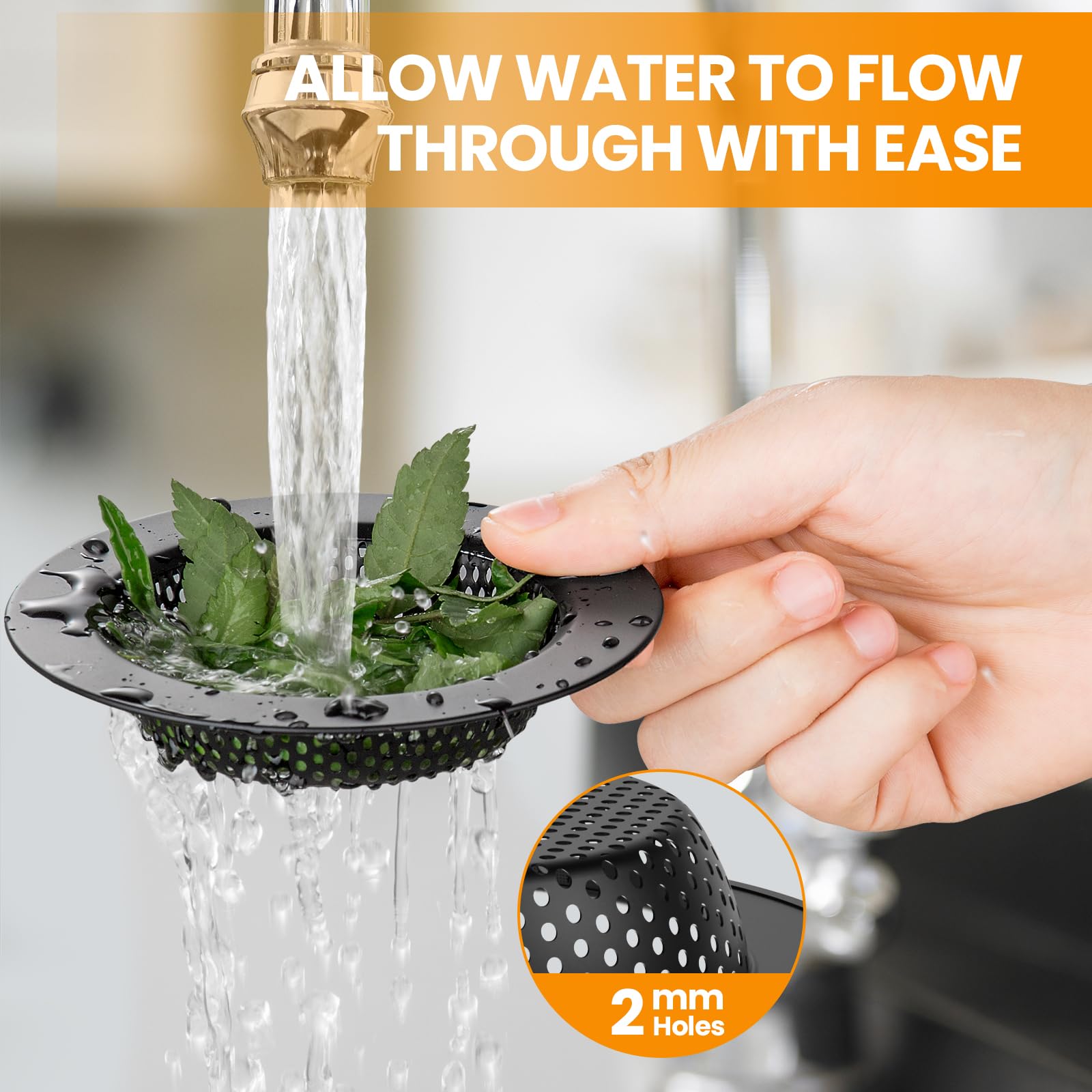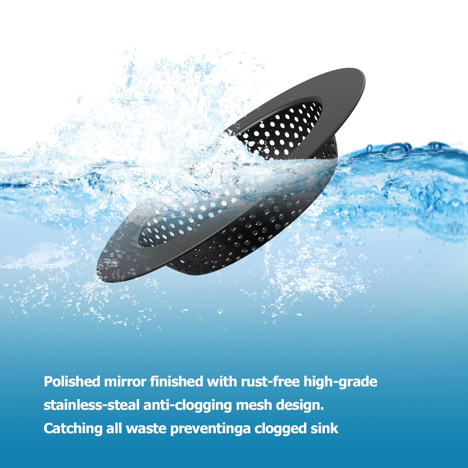 - [KITCHEN SINK DRAIN STRAINER] Made of 304 stainless steel, rust-free, and overall thickening, which is more sturdy, durable and not deformed. Designde with 0.08 inch drain pore and large basket for collected food particles and debris. The drain strainer can keep draining smoothly even after it full catchered.Perfect for US standard kitchen sink drains (3-1/2" / 3-3/8" / 3-1/4").