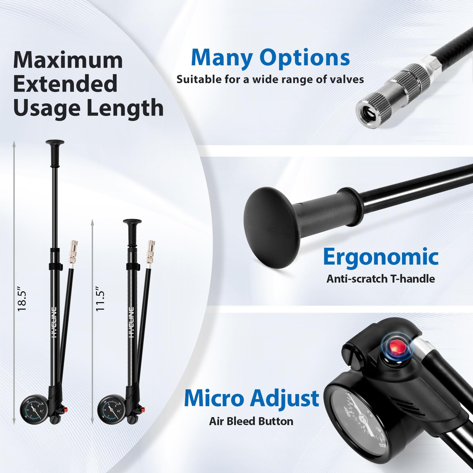 - 【Precise Adjustment】The fork pump has a 1.6 inches gauge(PSI and BAR) for accurate readings. It has a bleed function for fine-tuning the pressure (about 1-2 psi per button press)