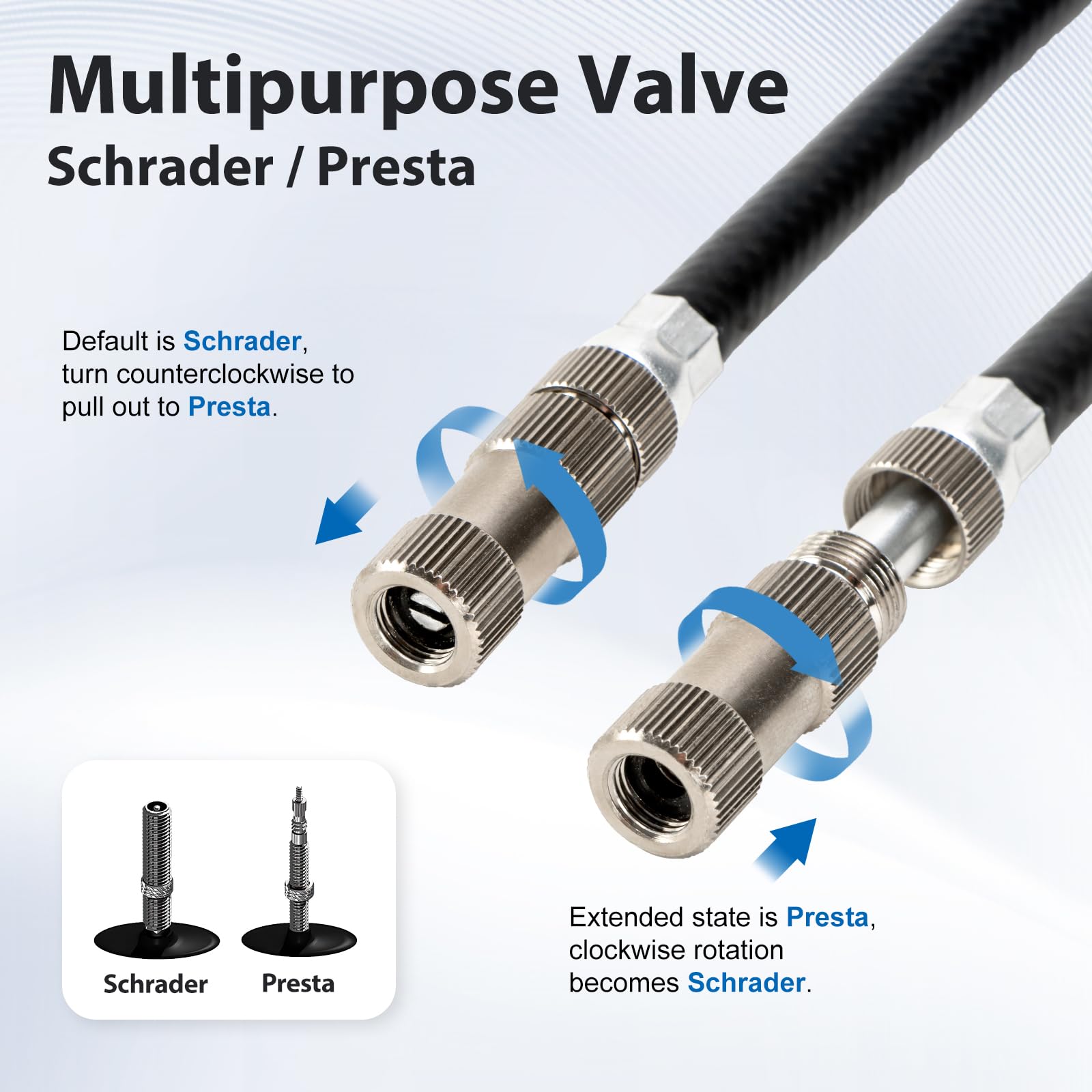 - 【Easy to Use】The bicycle pump comes with a 360° rotating and 11" long hose, offering great maneuverability. The ergonomic T-handle design helps you save effort and time while pumping.