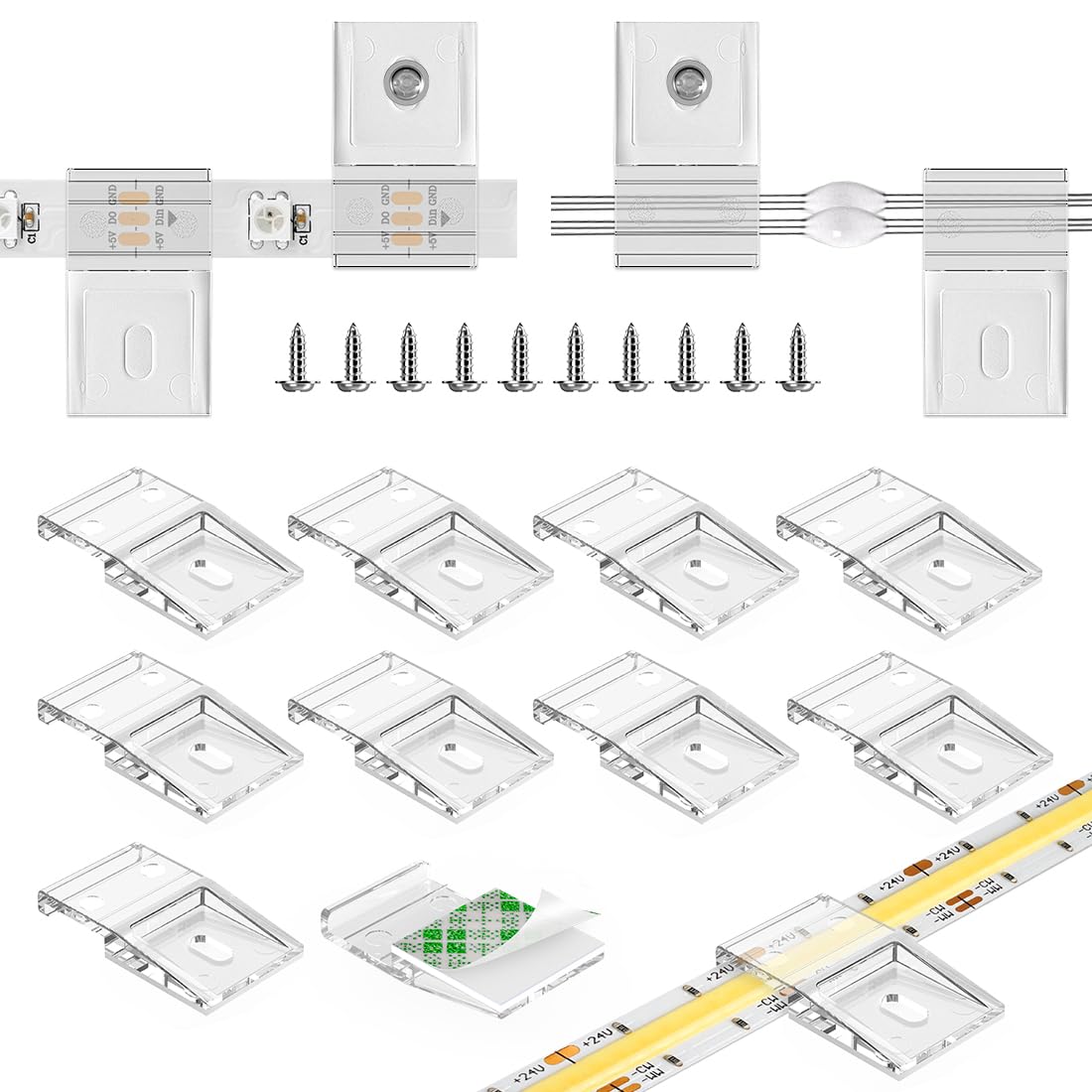 - 50 x 0.47in/12mm wide transparent LED light clips, 50 x screws.If you have any problems with this product or encounter problems in the process of using it, you can contact us via email, and we will help you solve this problem within 24 hours.