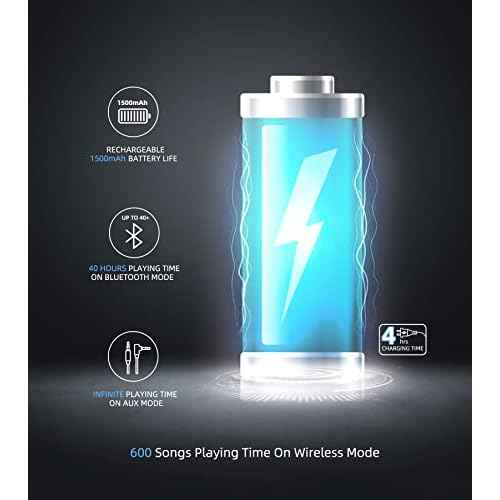 - Built-in 1500 mAh Rechargeable Battery - Large capacity battery allows you to play up to 600 songs for 40 hours of uninterrupted use. The rechargeable battery also saves money. Unlimited play time with AUX audio cable connect to your devices