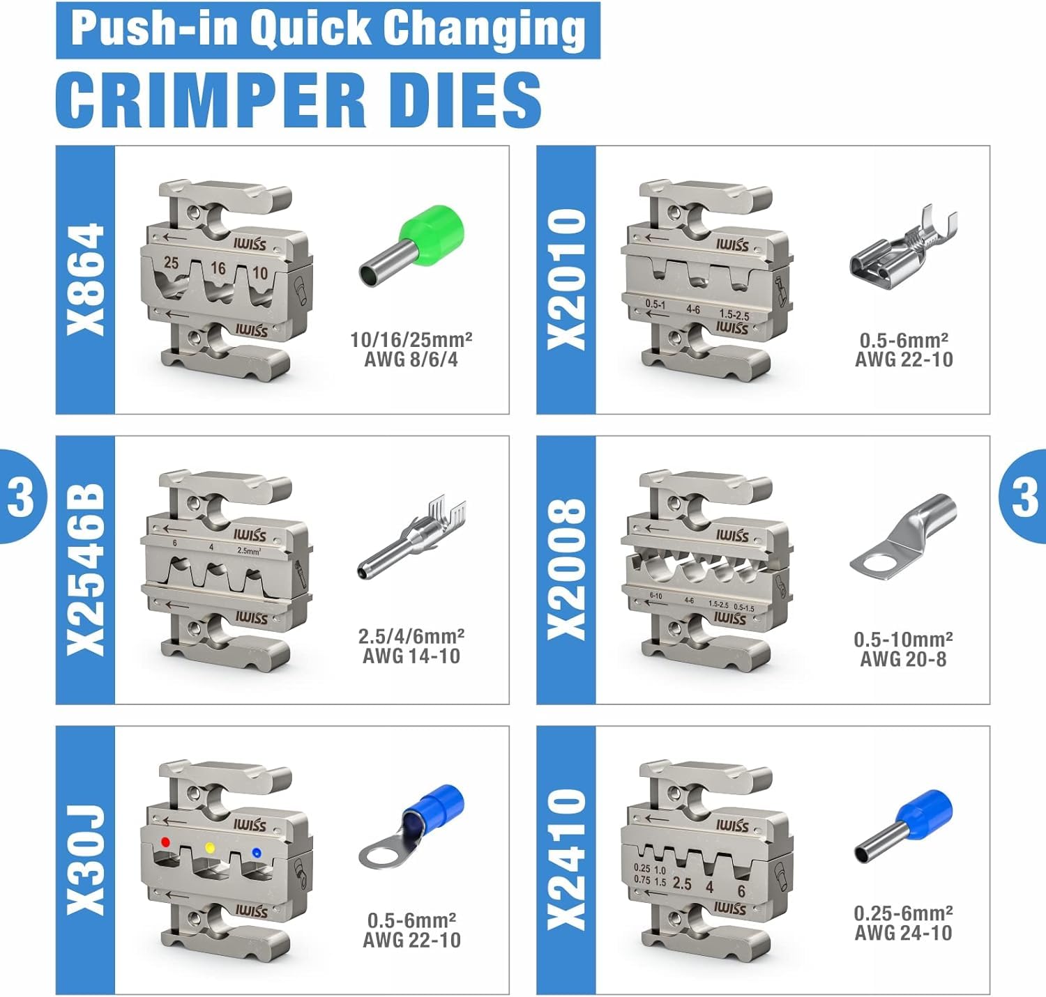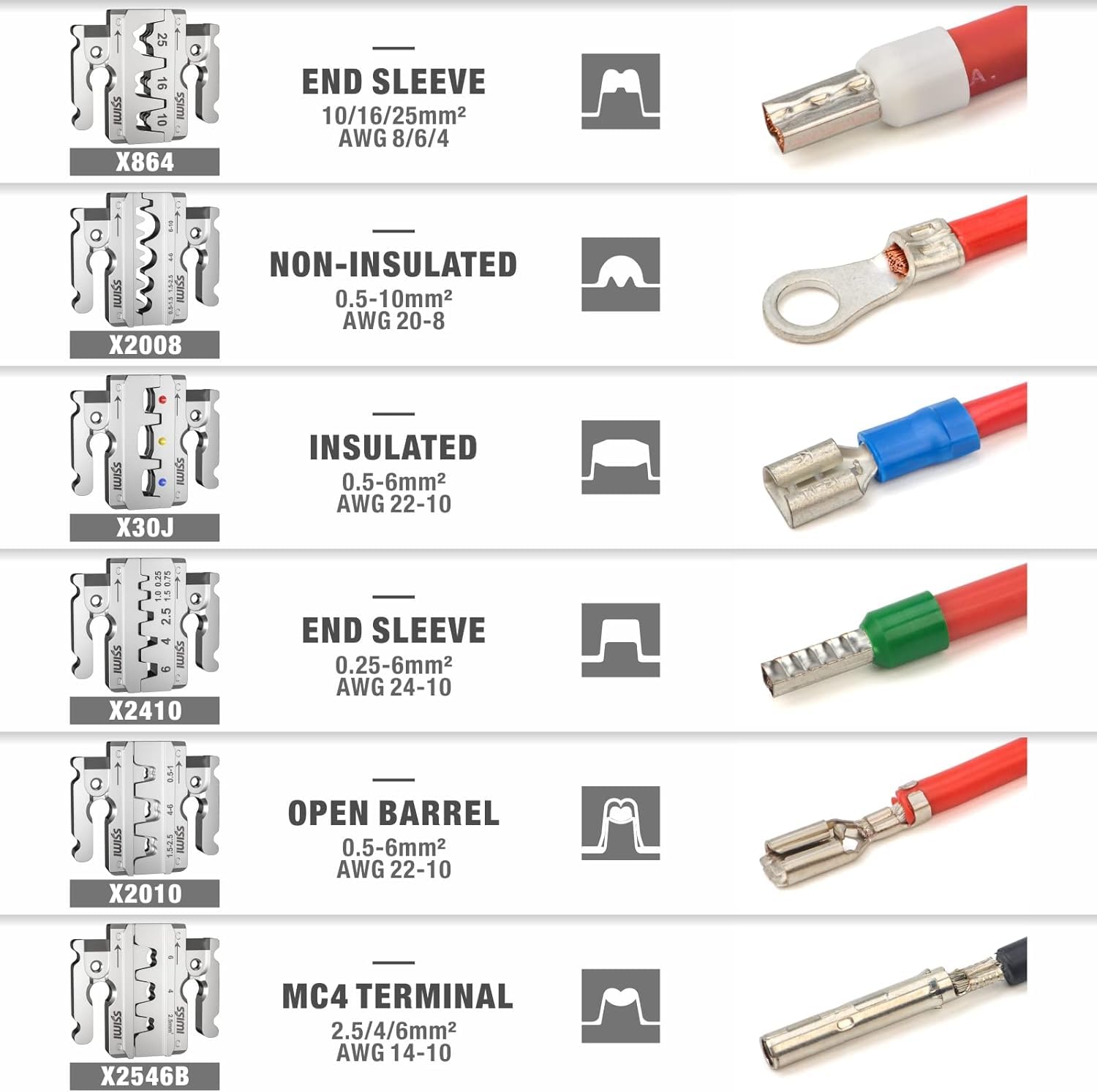 - Cut, Strip and Crimp wire and terminals from AWG 22-10. 6 quick change crimping die sets meet your wiring demand for insulated terminals, non-insulated connector, battery cable lugs, heat shrink connectors.