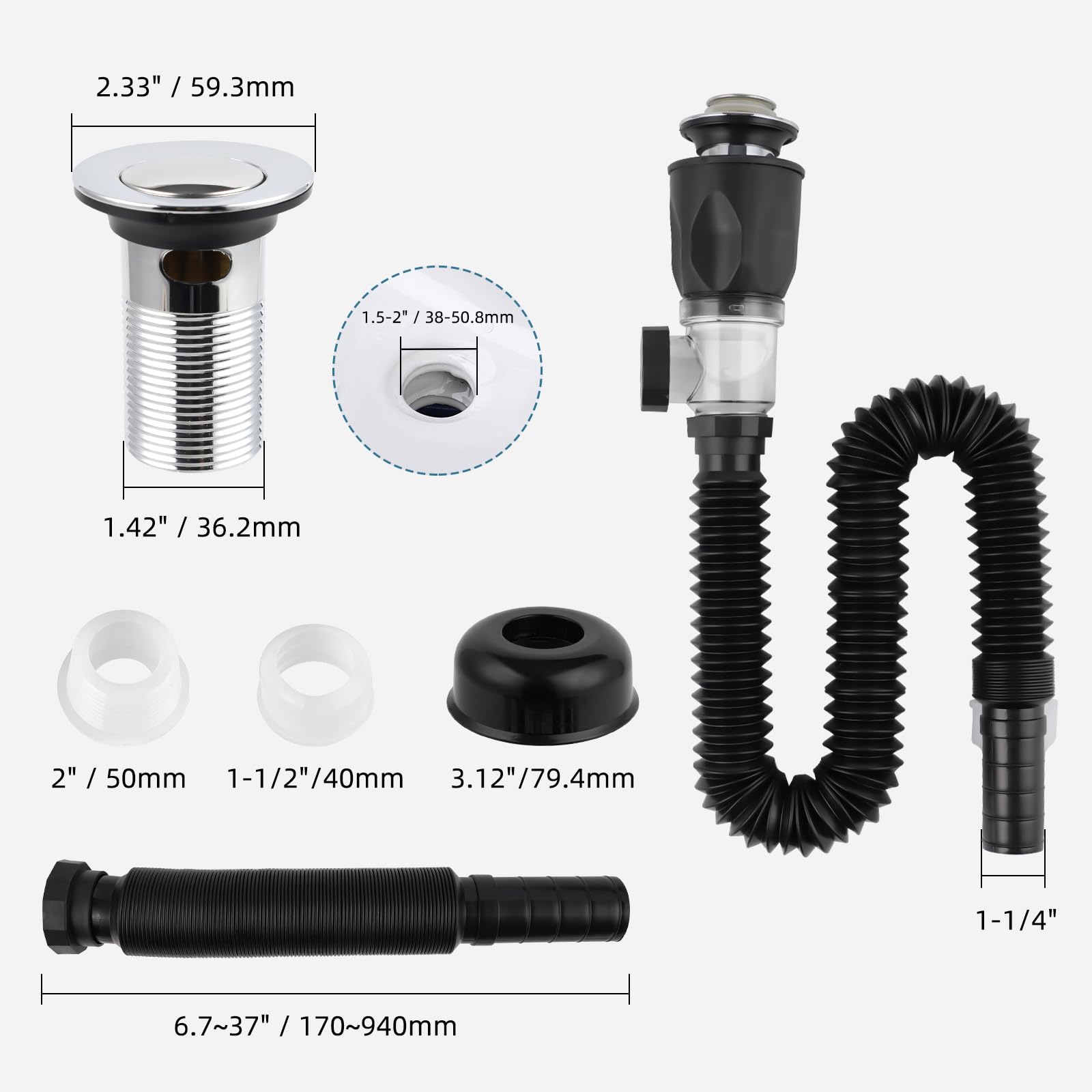 - Universal Compatibility: This bathroom sink drain pipe is designed to fit 1-1/4", 1-1/2" and 2" drain holes and the pop up stopper fits 1.5"-2" holes of the sink with overflow and without overflow, making it compatible with a wide range of sinks. The flexible drain pipe can expand from 6.7" to 37". Note: Please measure the diameter of your sink hole and drain hole before purchasing