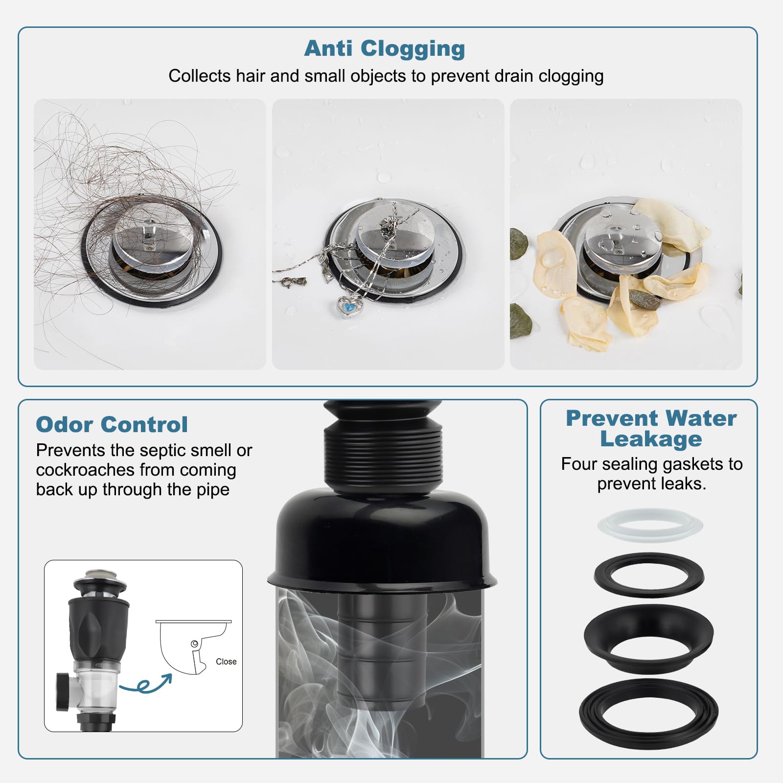 - Leak-Proof Design for Peace of Mind: Comes with strainer stopper, P-trap tubing, sealing gaskets and sealing plug. We've incorporated four thickened silica-gel gaskets at the junction of the drain plug and drainer to prevent leaks. Simply ensure the gaskets are in the correct position, and you can rest assured that your bathroom sink won't leak