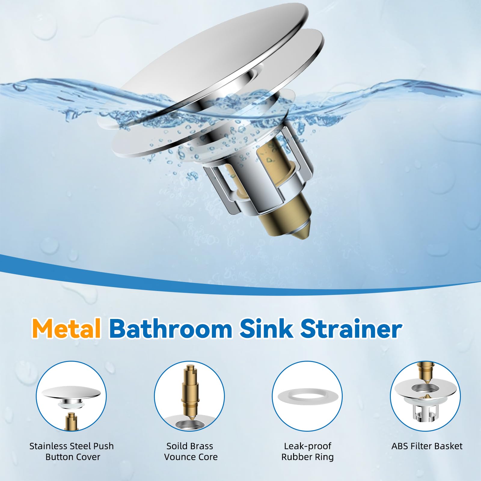 - Premium Metal Construction: Made from high-grade 304 stainless steel and ABS, this pop-up drain stopper for a bathroom sink is rust-resistant, corrosion-resistant, and built to withstand everyday wear, making it a great choice for humid bathrooms. The reinforced brass components, including the button cap and bounce core, provide excellent rebound strength and a long lifespan, making it a reliable addition to your bathroom fixtures