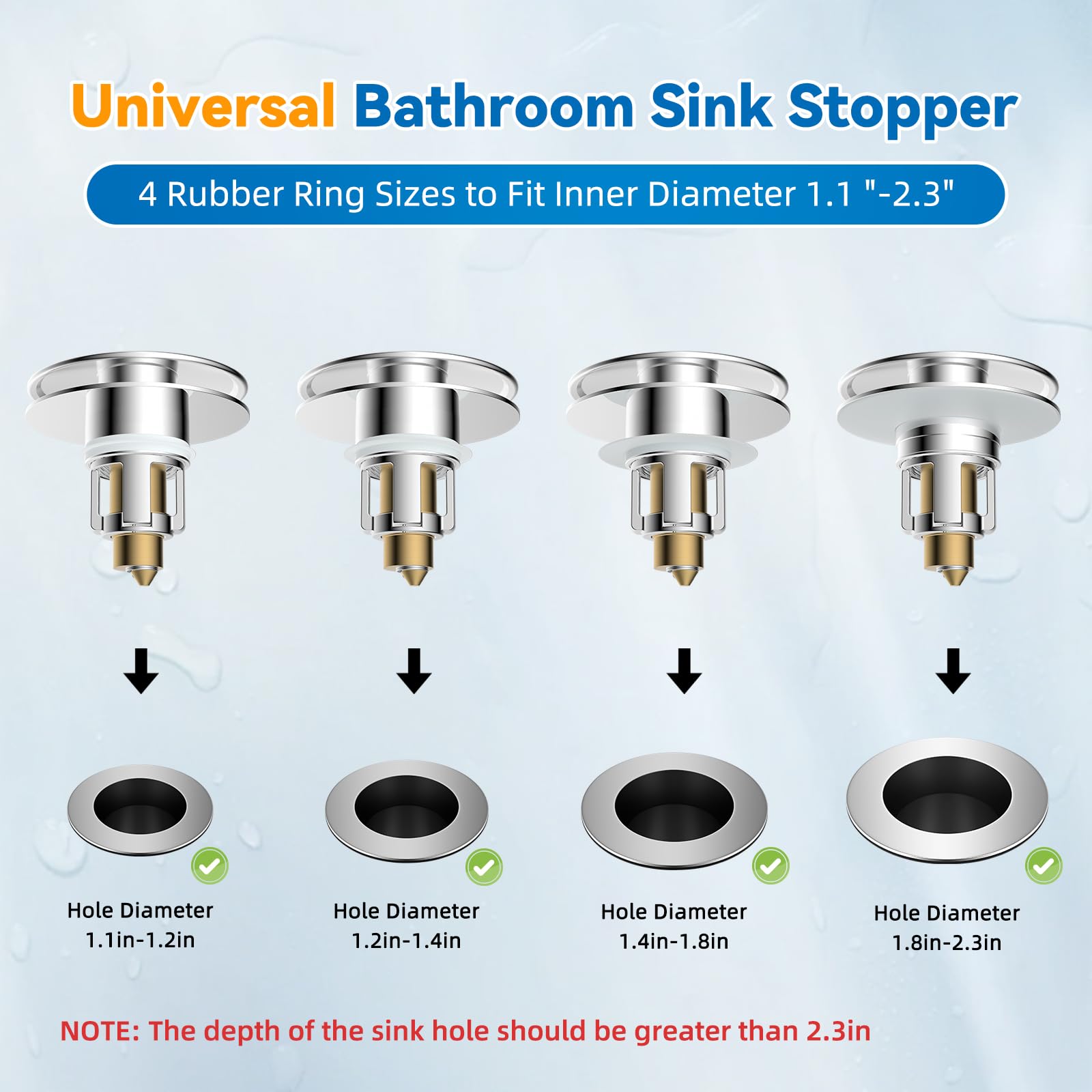 - Universal Fit for Broad Compatibility: Designed to fit most US bathroom sinks drain openings from 1.1" to 2.36". With four adjustable O-rings included, you can create a suitable seal across various sink sizes. Whether upgrading an old sink or matching a modern basin, this universal fit eliminates compatibility worries. Note: Not suitable for bathtub drains