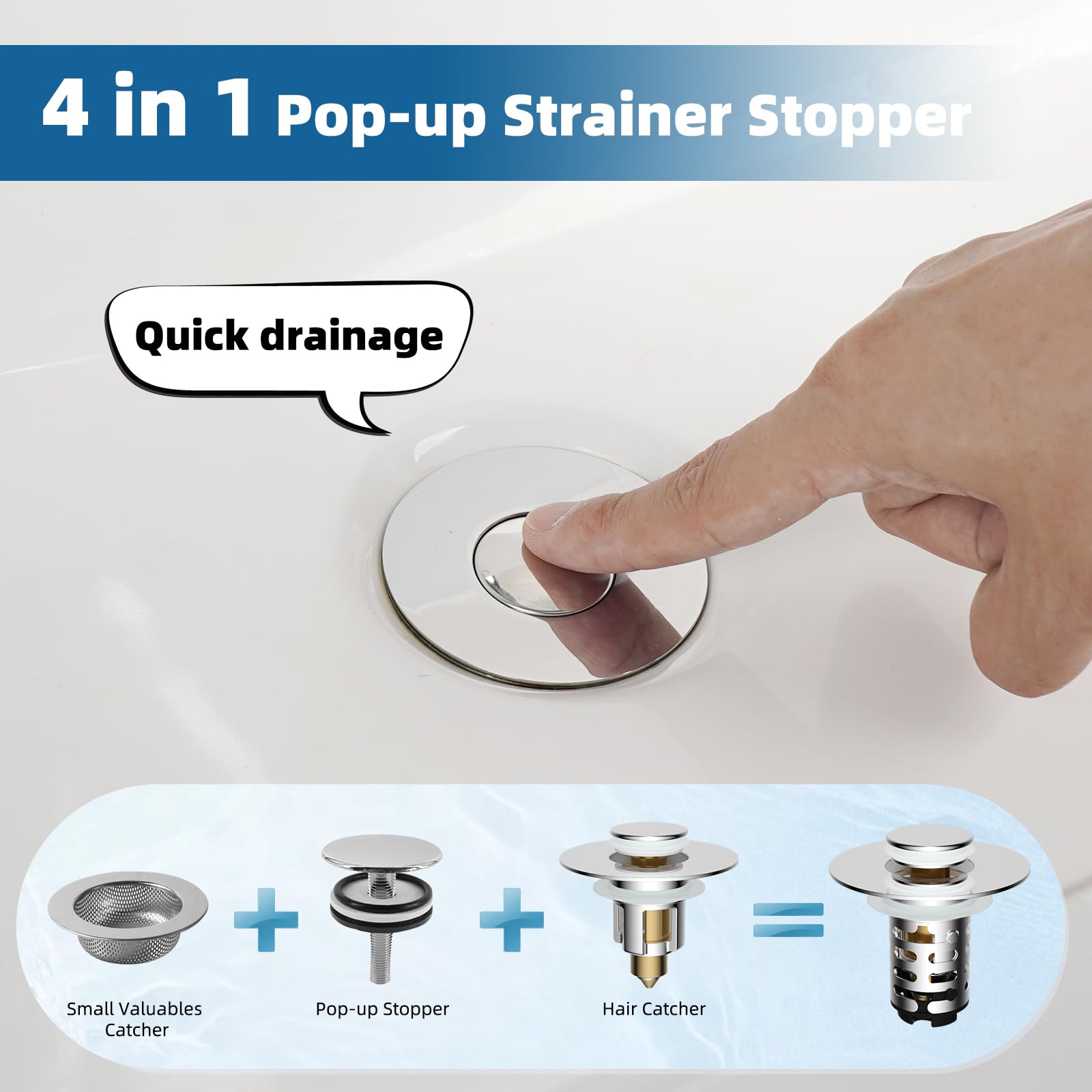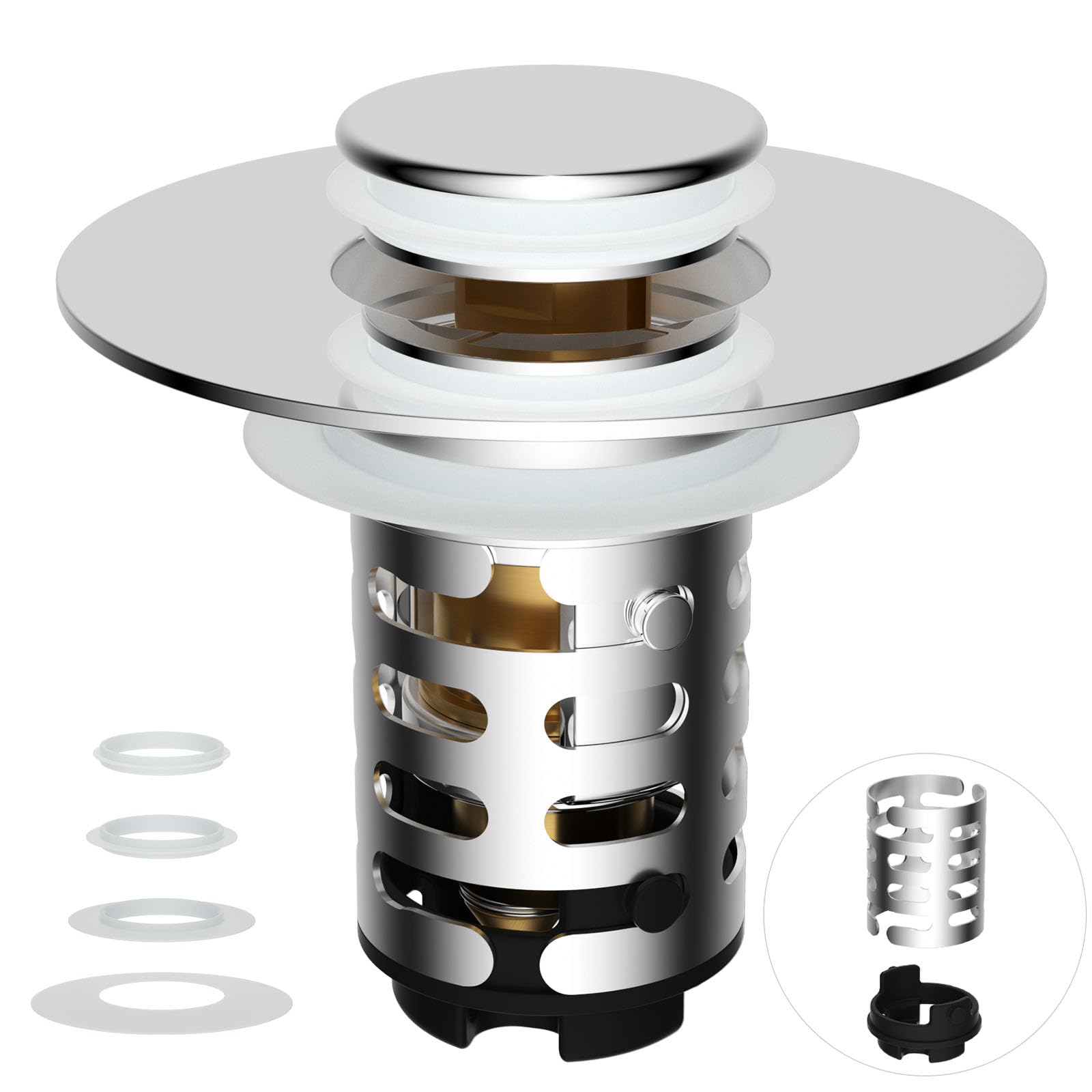 - Premium Metal Pop-up Sink Drain Strainer: The stainless steel body is constructed with premium materials to withstand corrosion for long-lasting durability. The scratch-resistant ABS pop-up stopper withstands extreme temperatures (-22°F to 212°F) and is worn daily without cracking. With a long-lasting yet sensitive solid brass pop-up mechanism, simply press lightly to switch between water storage and rapid drainage modes effortlessly