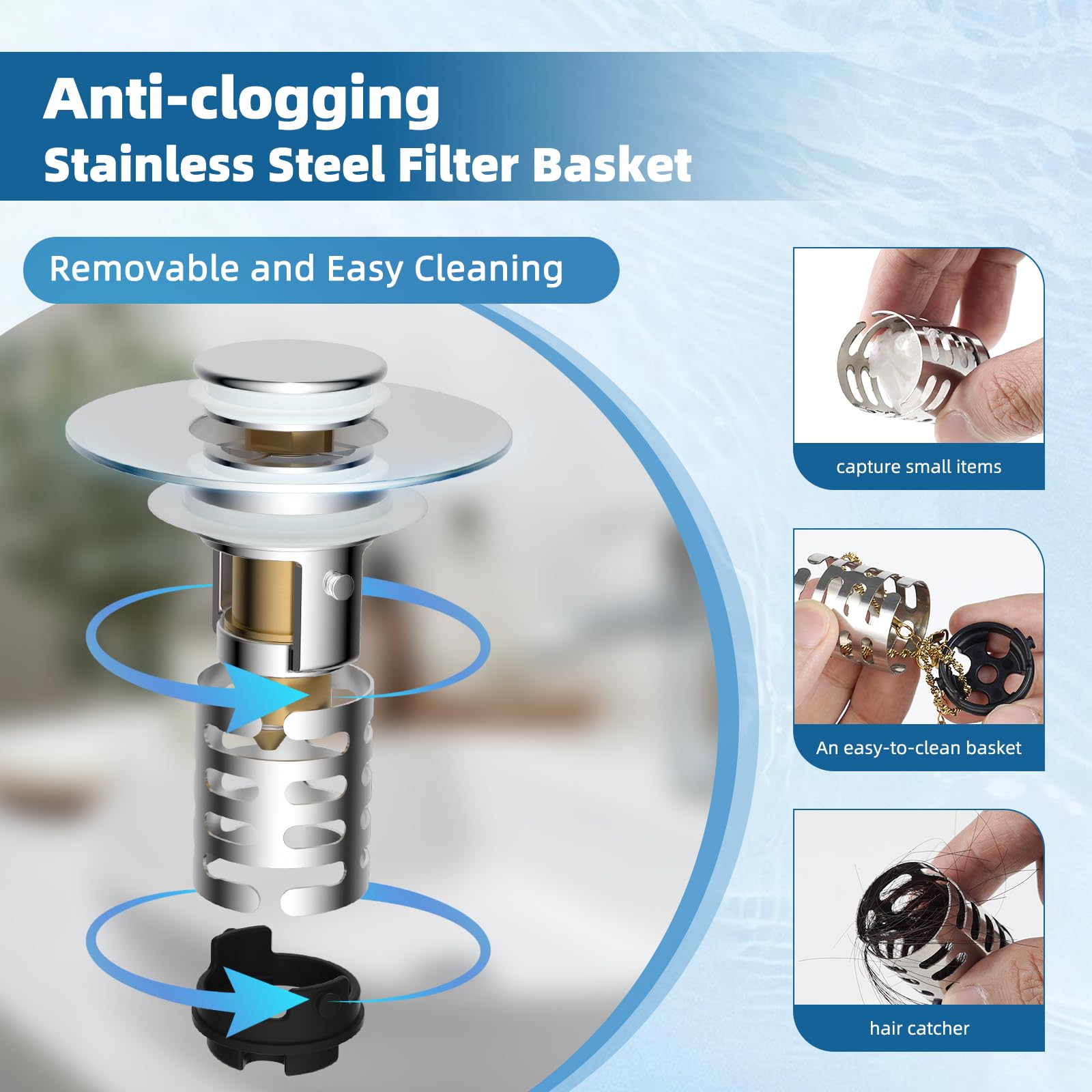 - Easy Installation and Cleaning: It only takes a few seconds to install and no tools are required. The bathroom sink drain stopper can easily be disassembled and cleaned. The removable basket bottom allows thorough cleaning without direct contact with trapped debris