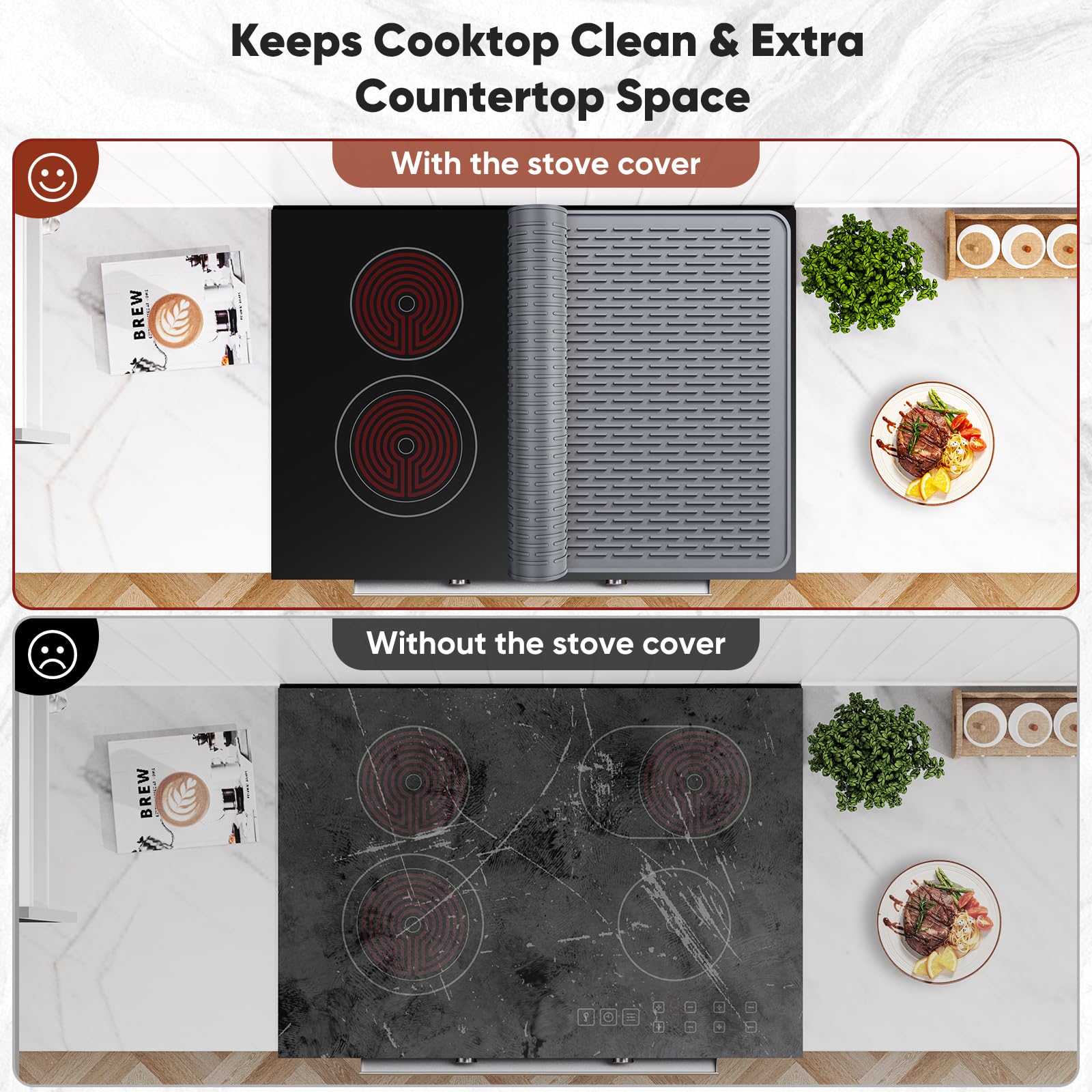 - Two Sizes & Colors Available: The stove top covers for electric stove is available in 28"Lx20"W and 30"Lx21"W to fit most electric stoves. Choose from classic black or elegant grey to match your kitchen decor.