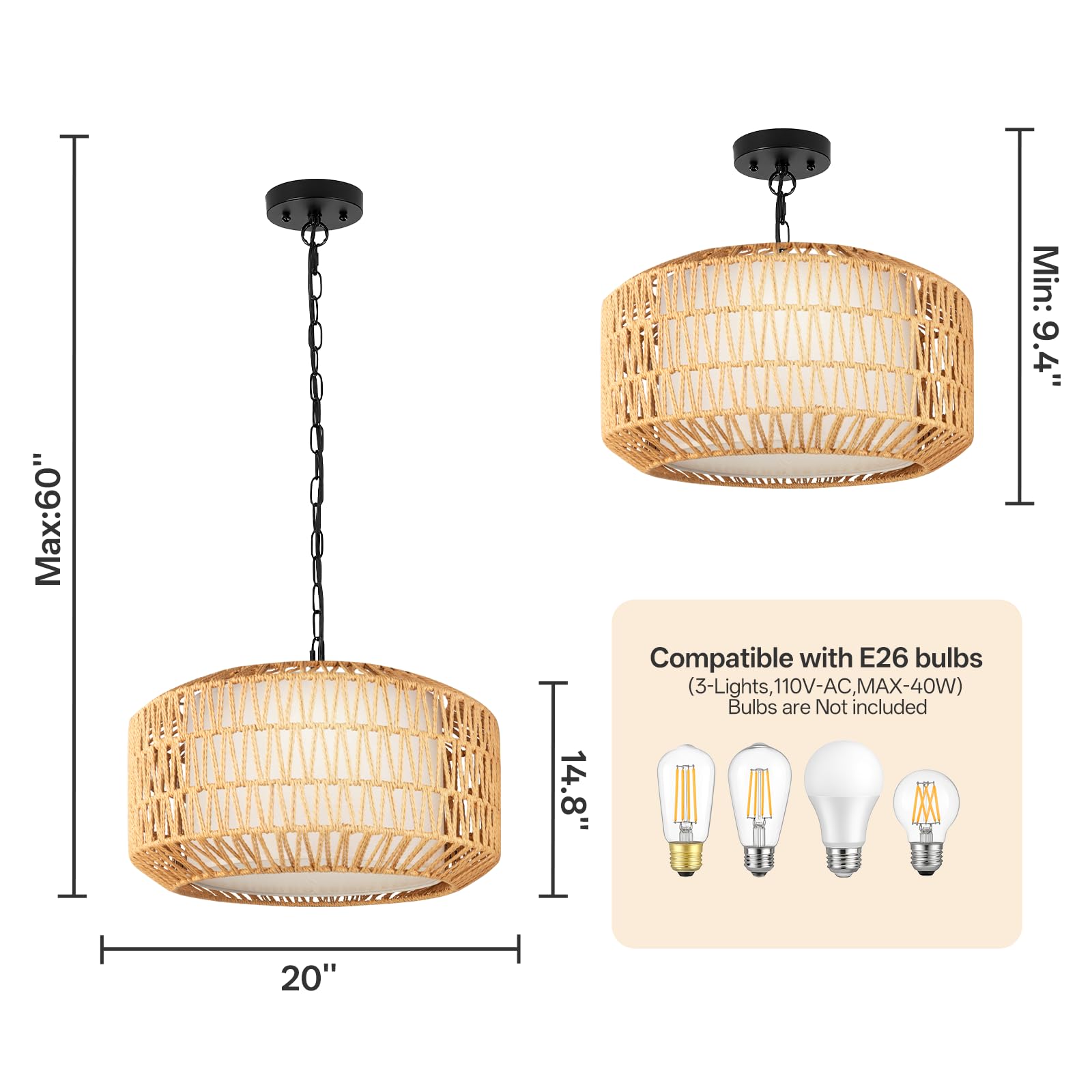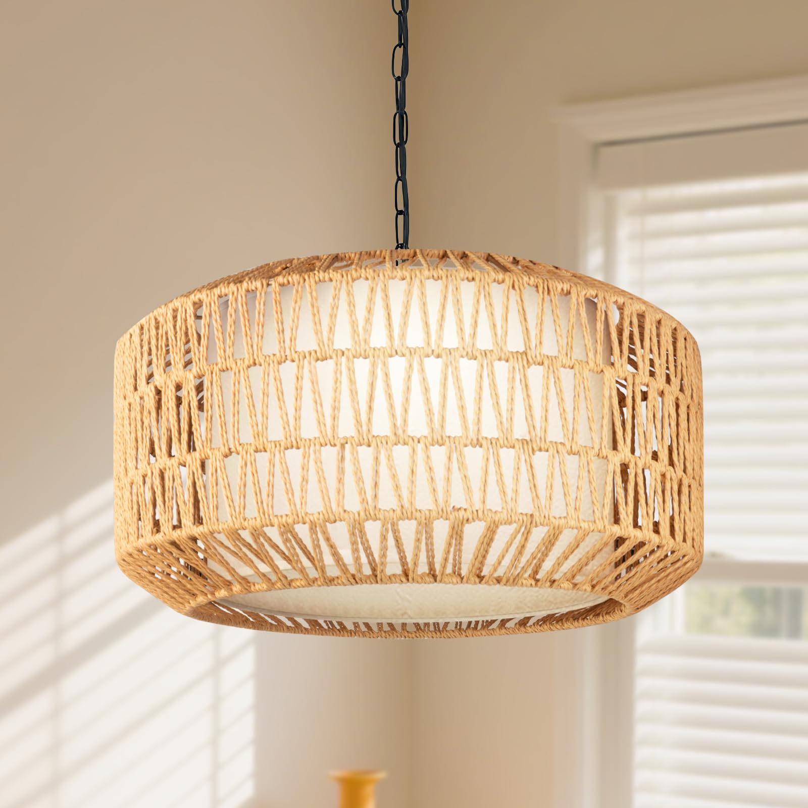 ILVUFORGOOD Boho Rattan Chandelier, 3-Light Farmhouse Pendant Light with Linen Shade, Hand-Woven Ceiling Light Fixture for Dining Room, Bedroom, Kitchen Island, E26 Base (Bulbs Not Included)