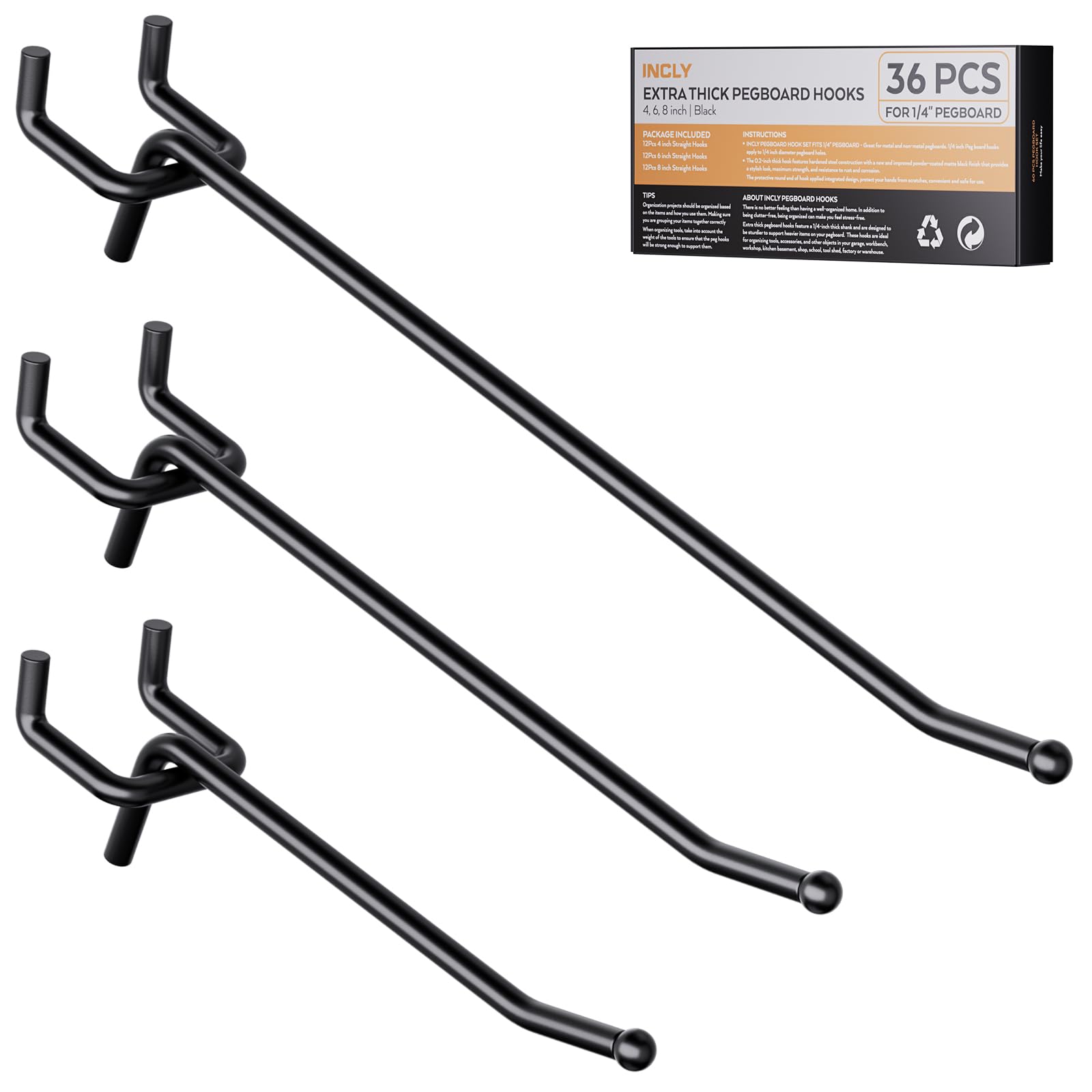 INCLY 36 Pack 4/6/8 Inch Black Pegboard Hooks, 1/4" Heavy Duty Peg Board Shelving Hooks Accessories, Peg Board Tool Hangers Fit 1/4" Pegboard for Organizing Garage, Craft Room, Kitchen, Store
