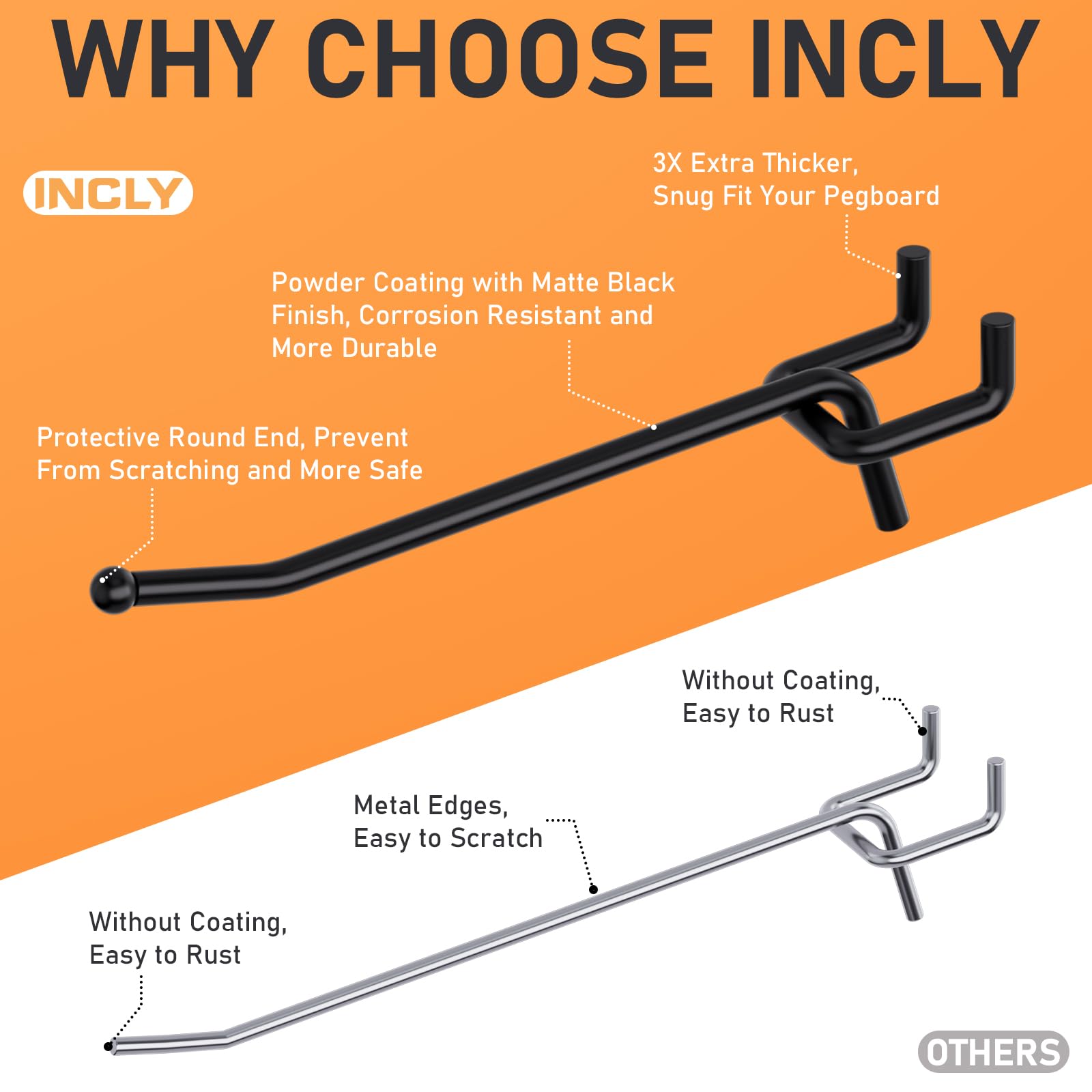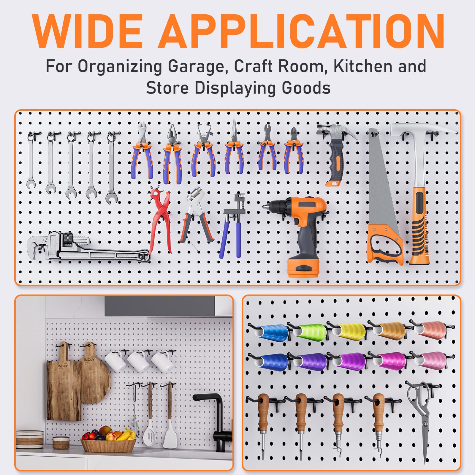 - WIDE APPLICATION: The INCLY 1/4" pegboard hooks are ideal for storage solutions on a wide range of garage, workbench, kitchen, craft room, sewing room, workshop, basement, store, tool sheds, warehouse. Also perfect for displaying you stuff like earing or necklace